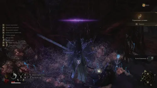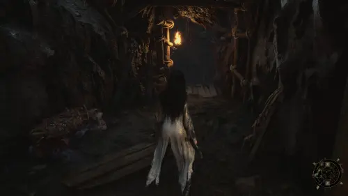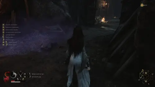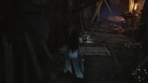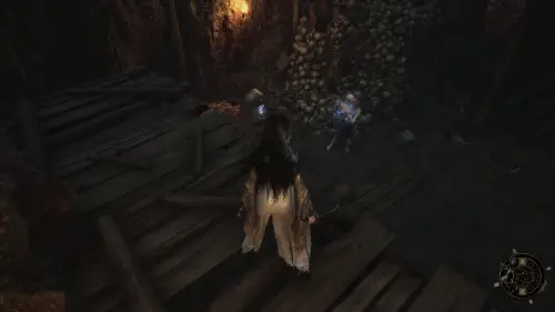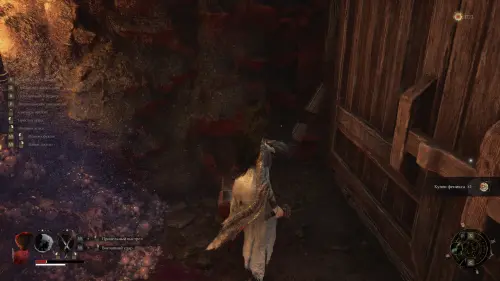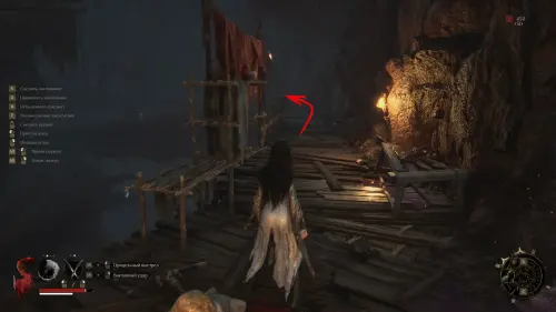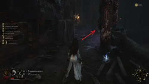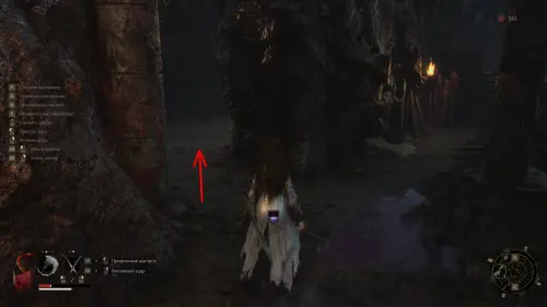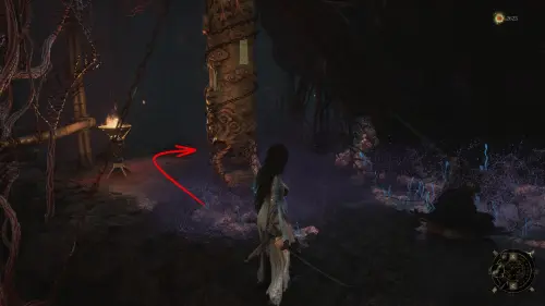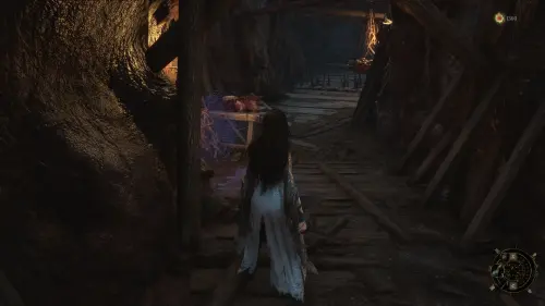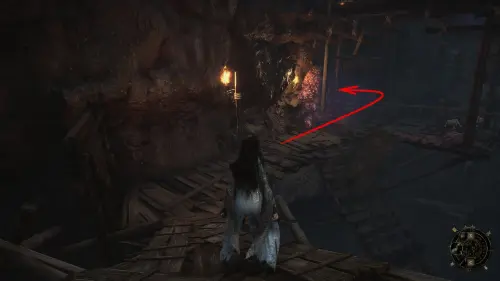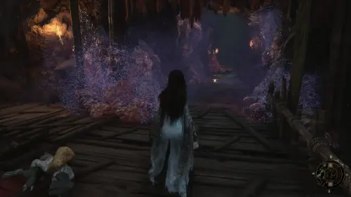 Спуститесь вниз, следуйте по деревянной тропинке и сверните в ближайший туннель, заполненный фиолетовой дымкой. При долгом взаимодействии с ней, вы рискуете получить негативный эффект Порчи, так что старайтесь не задерживаться.