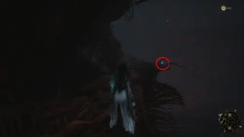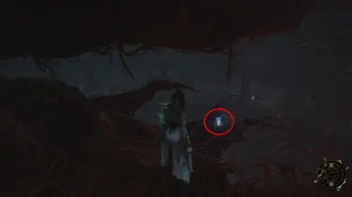 Выйдите наружу и снова вернитесь на тропу из красного материала. Бегите в правую сторону и зайдите в небольшую пещеру, чтобы забрать Тусклое красное перо.