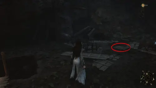 Вернитесь назад и следуйте дальше по красной тропе, пока не доберитесь до предмета, расположенного на самом краю. Как только вы подберете Цветок ситника, платформа под вами разрушится, и вы окажетесь на нижнем уровне мастерской.