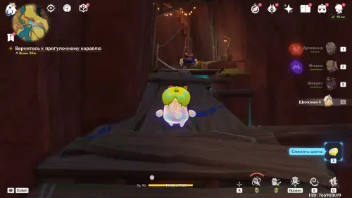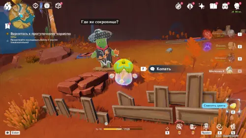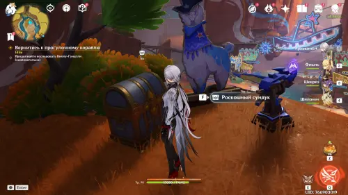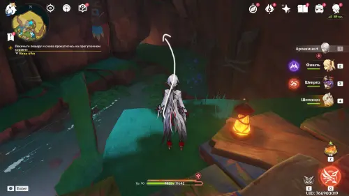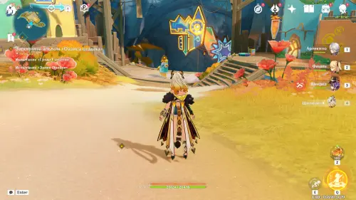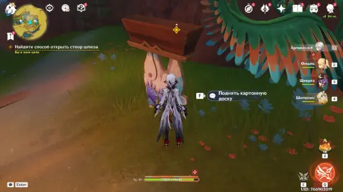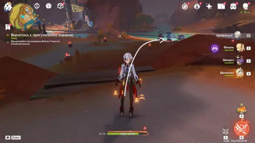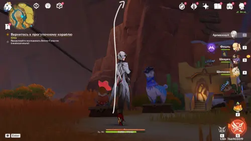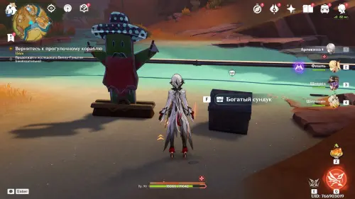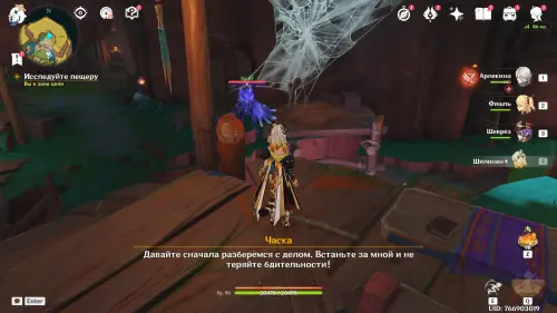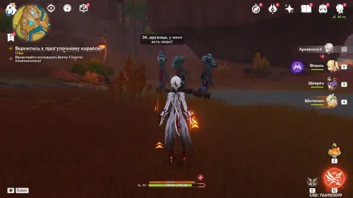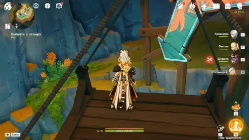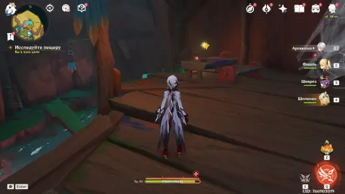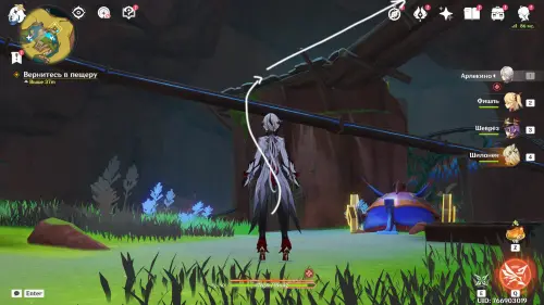 Пройдите внутрь пещеры и исследуйте стол, на который указывает желтая стрелочка. Внезапно появится сумрачная мимифлора в виде хиличурла-изгоя. Разберитесь с ней и снова пообщайтесь с друзьями. После прочтения записей, выберитесь из пещеры через проход на западе и вновь сядьте на прогулочный корабль.