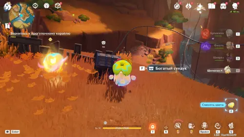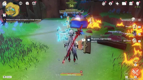 Глянув очередную кат-сцену, спланируйте вниз к телепорту, а потом подбегите к заблокированному богатому сундуку впереди и уничтожьте двух изгоев-хиличурлов. Заберите содержимое сундучка и поднимите картонную фигурку для получения от нее Ключа (важный предмет).