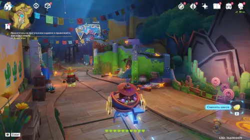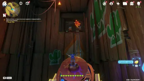 Пройдите вперед, встаньте на подъемник и спуститесь вниз. Продолжайте спускаться по деревянному помосту к следующему квестовому маркеру. Далее сядьте на прогулочный корабль и следуйте за шерифом к бару. Войдя внутрь, вы начнете первое испытание по стрельбе – вам нужно будет попадать в злых кактусов, стреляя в них краской. Для восстановления здоровья стреляйте в золотые флаконы. На видео ниже показано прохождение данного этапа.