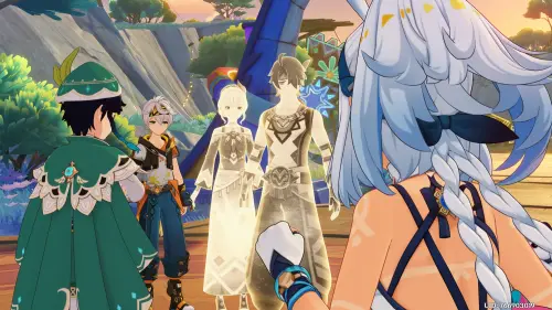 Сделайте совместное фото со всеми своими друзьями из Натлана, а потом гляньте прощальную кат-сцену Беннета с родителями. На этом задание подойдет к концу. В качестве вознаграждения вы получите 700 очков приключений, 80 примогемов, 60 тысяч моры, 8 книг опыта, 8 волшебной руды усиления, 1 значок безмятежности и декоративный предмет «Звезда удачи».