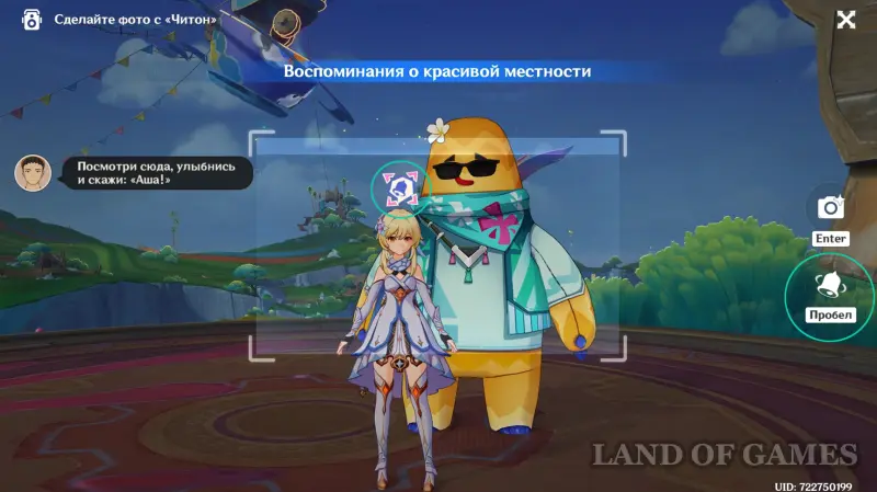 Поднимаемся наверх и сообщаем Аохотии, что готовы начинать (убедитесь, что вы не в облике аши). Чтобы выполнить задачу «Воспоминания о красивой местности», нажмите один раз на колокольчик над готовой ГГ, чтобы герои по ту сторону объектива встали в позы, а затем сделайте снимок.