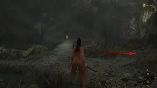 Бегите обратно и перед подъемом в деревню, сверните вправо. Взаимодействуйте со статуэткой и используйте позу «Изучить», чтобы получить ценный предмет Шелковый платок Шу.