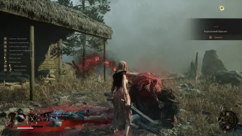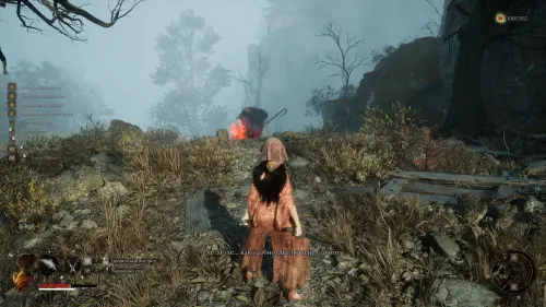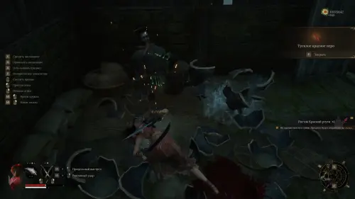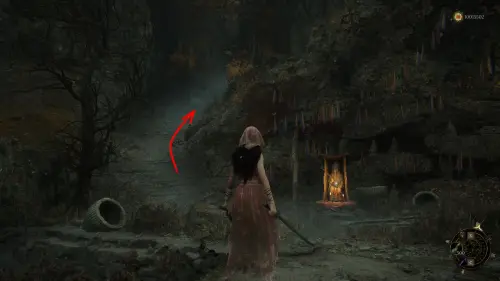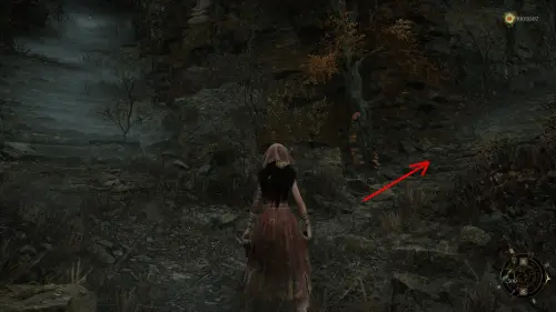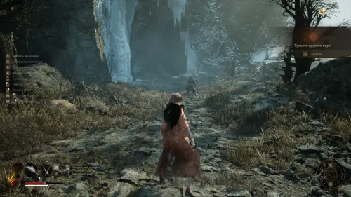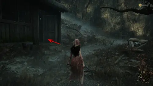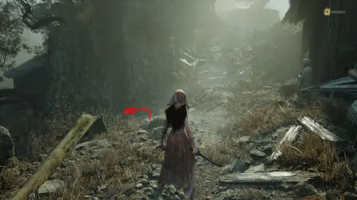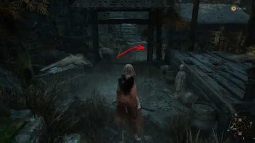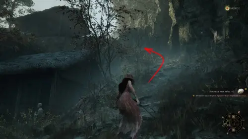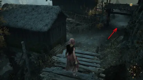 Далее начните подъем по тропинке слева, а затем сверните направо. Следуйте вперед, пока не наткнетесь на заброшенную деревню. Внутри первого дома вы сможете получить Тусклое красное перо, убив мимика.