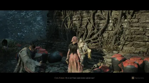 При желании поговорите с воинами и следуйте дальше к огромному засохшему дереву, где местные будут собирать травы.