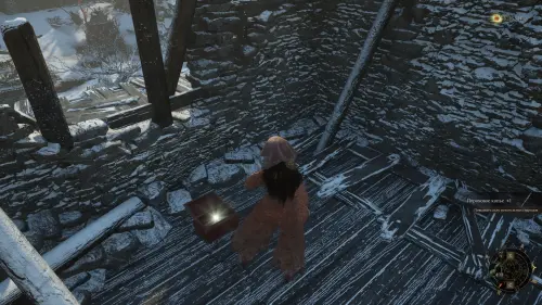 Сверните вправо и обойдите палатку. Поднимитесь по лестнице и зайдите за дом, чтобы забрать Божественные письмена.