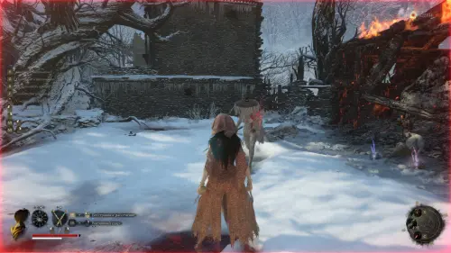 Спуститесь с башни и следуйте по дороге в правую сторону. Во дворе с горящим домом вас застанет врасплох Внутренний демон. После боя вы получите Теневую каменную иглу — Магия.