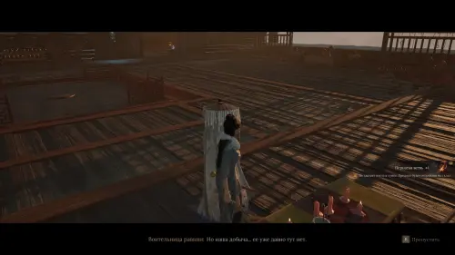 Оказавшись на крыше, побеседуйте с Воительницей равнин, чтобы получить Пернатую ветвь. Заберите с трупа Окровавленное письмо и камень Та — Ускоренный мороз с небольшого столика.