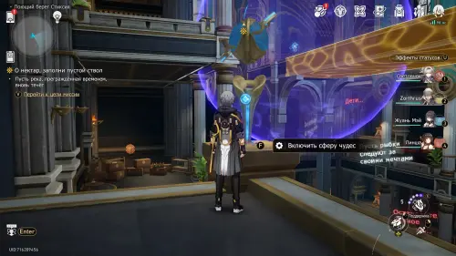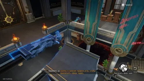 Далее вам нужно будет перейти на другую сторону, починив мост. Для этого сначала активируйте киот Оронис (синяя сфера на постаменте), а затем выключите сферу чудес, расположенную с левой стороны моста (взаимодействуйте с ней, а потом нажмите на большую кнопку в правом нижнем углу). В результате мост будет частично восстановлен.