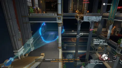 Оказавшись на другой стороне, спуститесь по лестнице вниз и нажмите на вторую сферу чудес. Затем направьте ее луч влево и включите, как показано на скриншотах ниже. Тем самым вы разблокируете путь впереди.