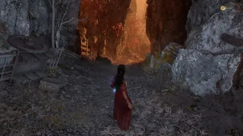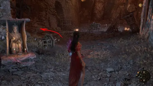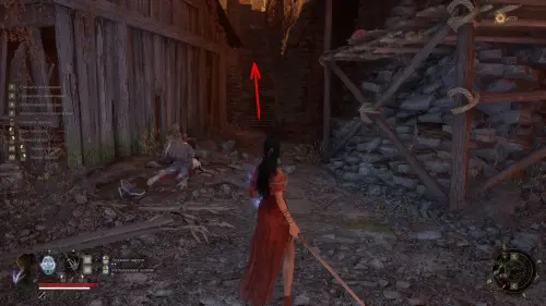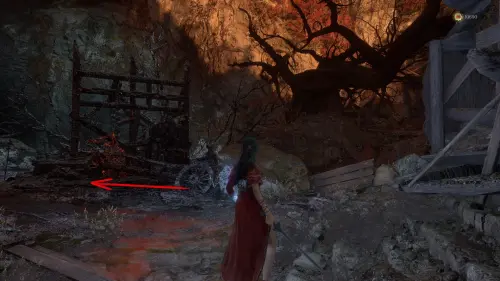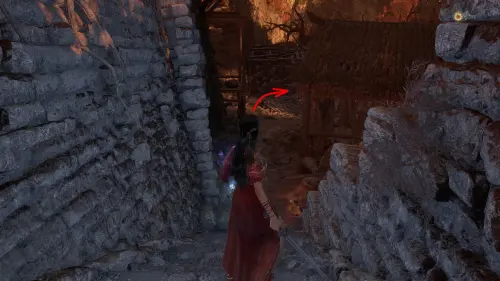 Спуститесь по лестнице вниз и бегите направо в разрушенное поселение. Зайдите в пещеру, вход в которую освещен факелом, чтобы добраться до Сверкающего красного пера на крыше дома.
