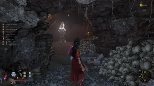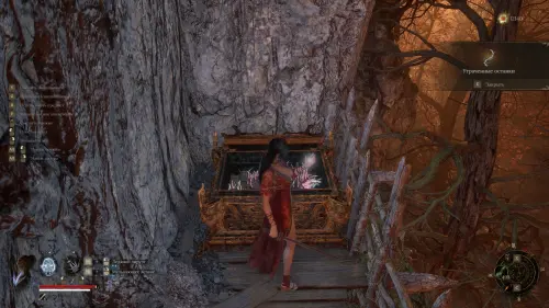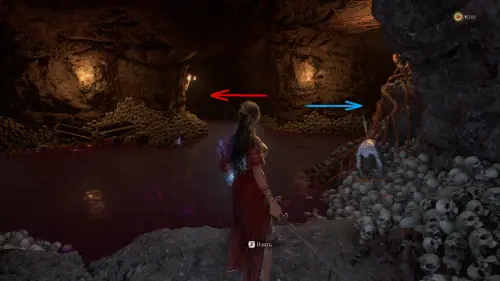 От этого места бегите в левую сторону и зайдите в пещеру, залитую кровью. Бегите в проход, отмеченный голубой стрелкой, чтобы забрать из золотого сундука Утраченные останки. Вернитесь назад и бегите по направлению красной стрелки, чтобы выйти наружу.