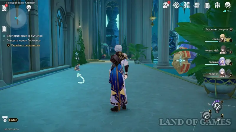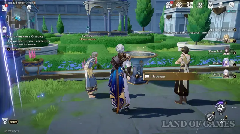 Далее перемещаемся к якорю на входе в Павильон родниковых песен и разговариваем с участниками квеста, стоящими около молитвенной чаши. В отличии от титана Океана, Гисиленса не была способна воспроизвести вкус нектара прямиком из сердец пирующих, но и у нее был свой метод — Нереиды хочет проверить свою догадку.
