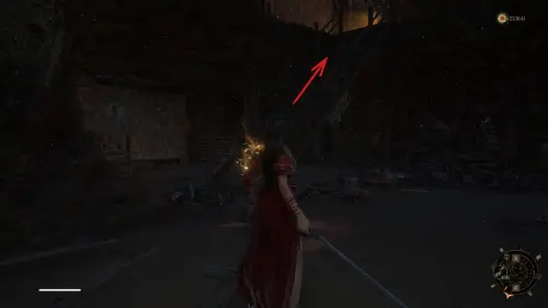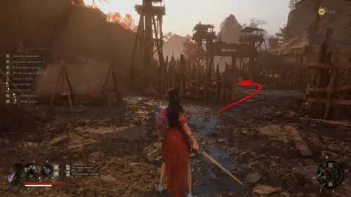 Спуститесь по лестнице, чтобы перейти в следующую область. Чтобы разблокировать короткий путь в Лагерь беженцев и подобрать Лучистое красное перо — спуститесь вправо по деревянным помостам.
