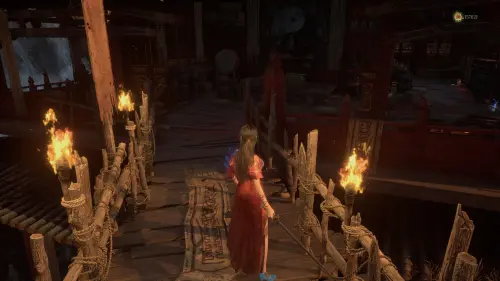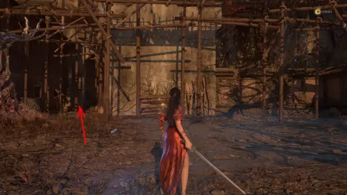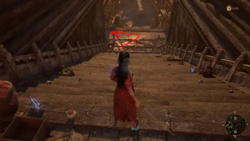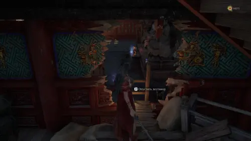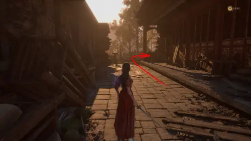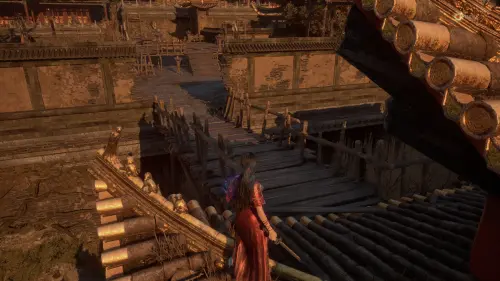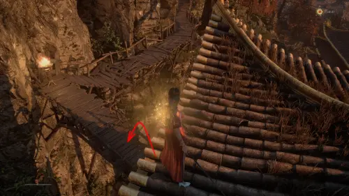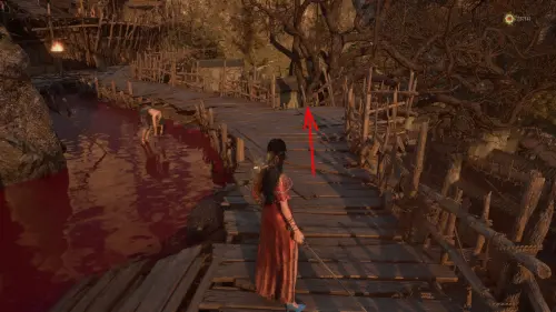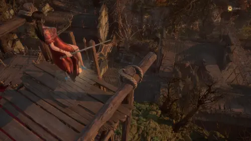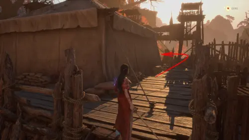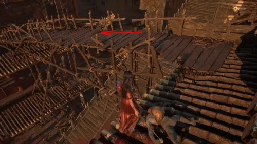 Вернитесь на главную лестницу и сверните влево. Пройдите через полуразрушенное здание и поднимитесь на крышу. Пройдите через деревянный мост на крышу дома напротив и спуститесь на два этажа ниже, чтобы сбросить лестницу, ведущую к основному святилищу.