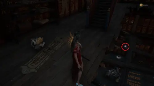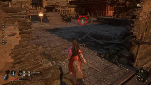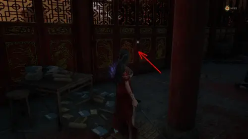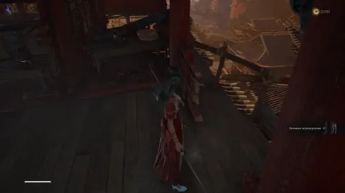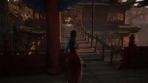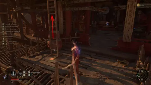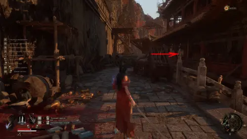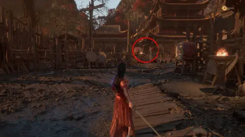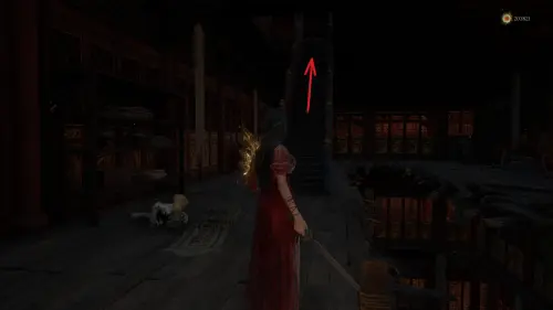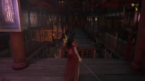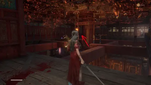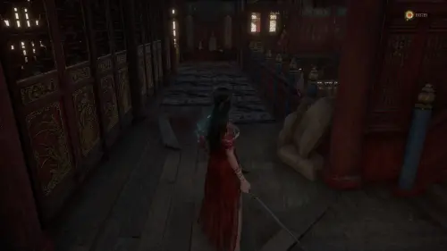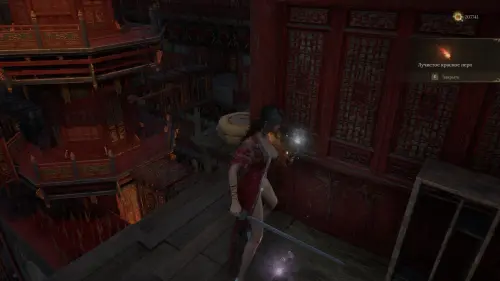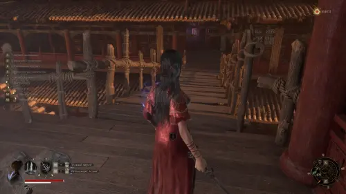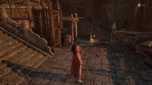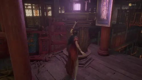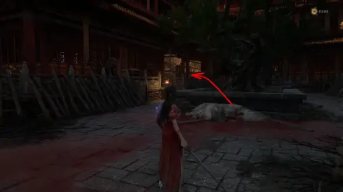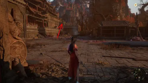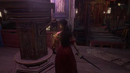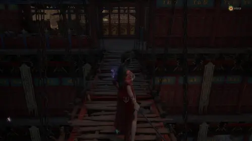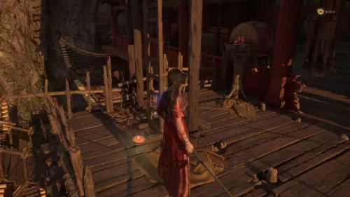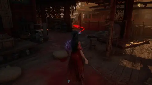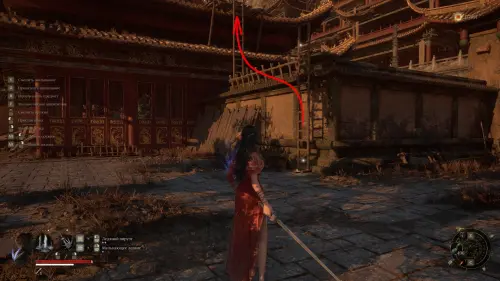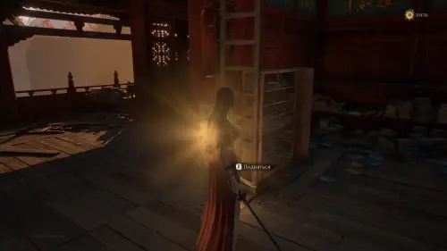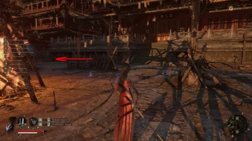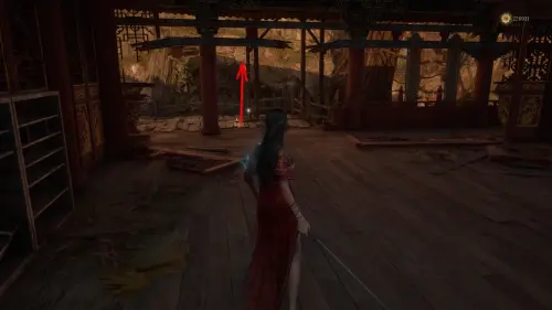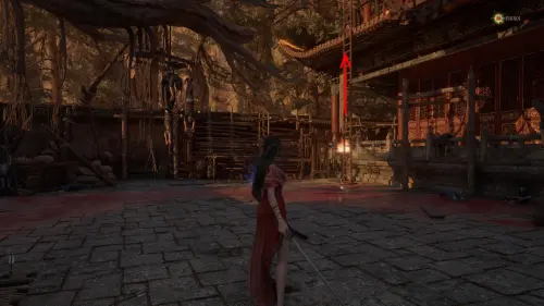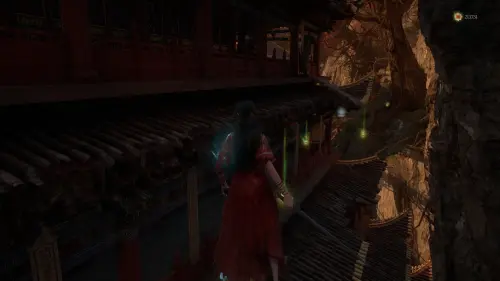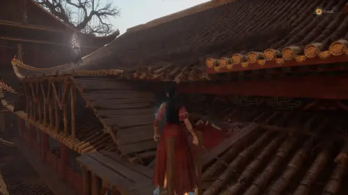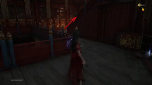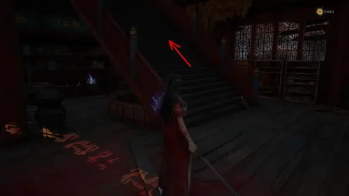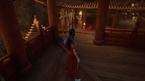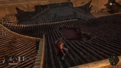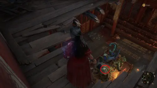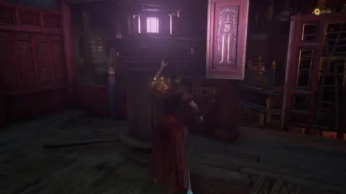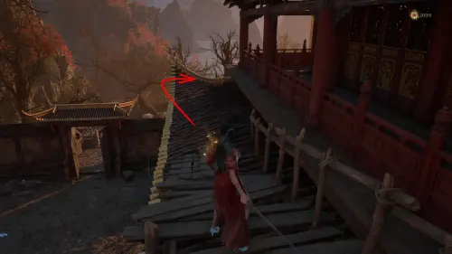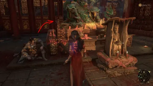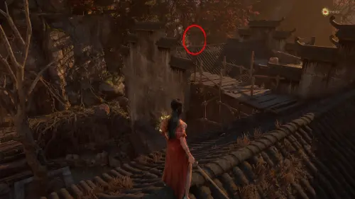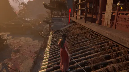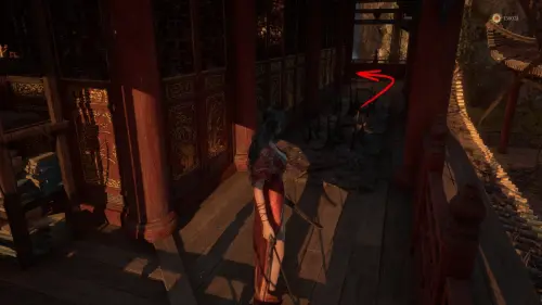 Вернитесь в предыдущий двор и заберитесь по лестнице на крышу пагоды, где стоит святилище Главного зала. Заберитесь внутрь через дыру в крыше, опустите лестницу и запрыгните на статую святилища, чтобы подобрать Кулон демона.