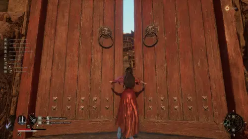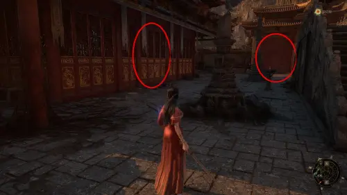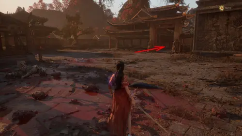 Бегите вправо и зайдите за разрушенную стену. Обойдите здание и откройте большие красные двери, ведущие на территорию Храма.