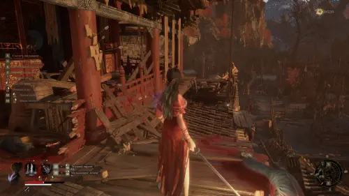 Вернитесь к старику и бегите вправо, чтобы покинуть Павильон. Поднимитесь на крышу и пройдите в левую ее часть. Спрыгните вниз на деревянный мост и бегите вперед, пока не заметите Воительницу равнин. Получив у нее Пернатую ветвь, бегите далее.