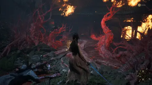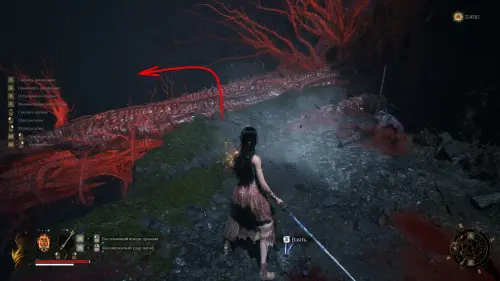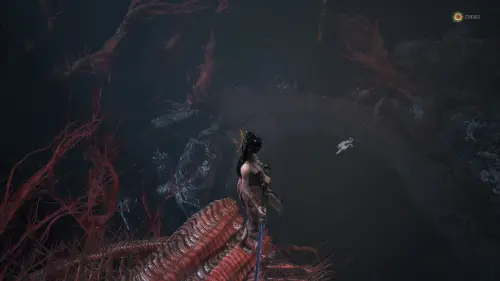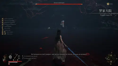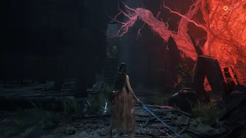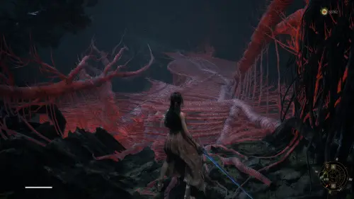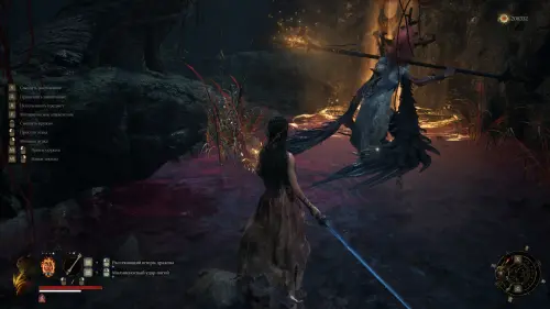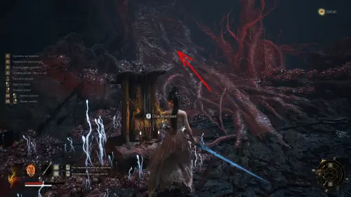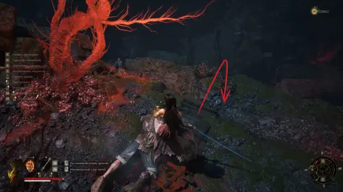Вернитесь к святилищу, пройдите через здание и спуститесь вниз. Спрыгните с красной лозы и сразитесь с боссом Багряные перья — Хунлань.