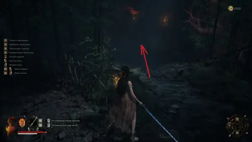 Вернитесь к исцеляющему кругу и бегите по мосту из красной лозы напротив. Убейте всех врагов, захвативших двор, заберите Штаны Оперенного охотника, а также Лучистое красное перо.