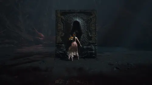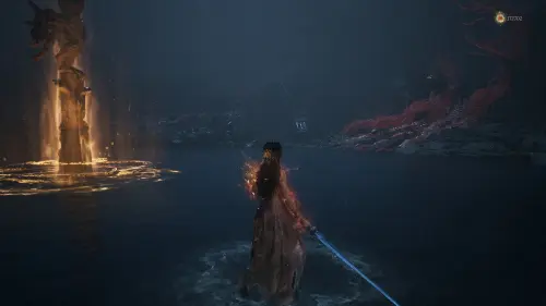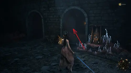 Бегите в левую часть дворца, как показано на скриншотах, и откройте Божественные врата, чтобы получить письмена Фа — Перья погибели.