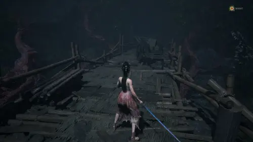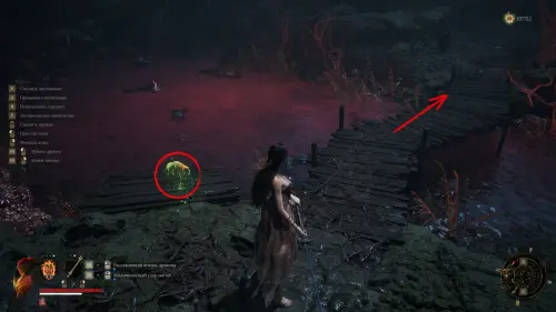 Пройдите по мосту из красной лозы и расправьтесь с врагами. Чтобы восстановить здоровье и сэкономить фляги, воспользуйтесь золотым исцеляющим кругом.