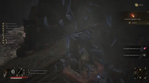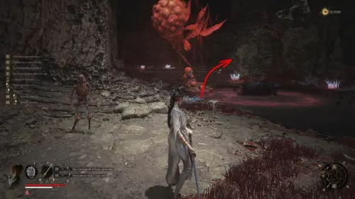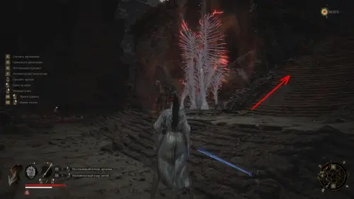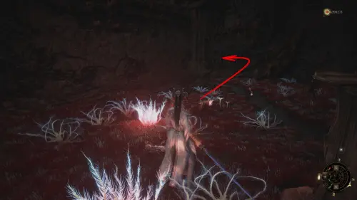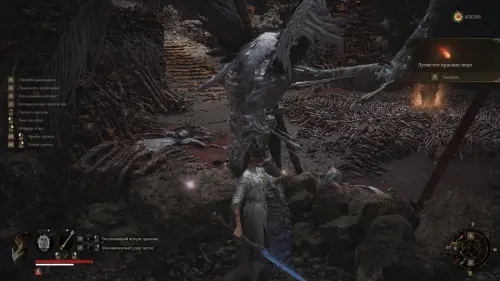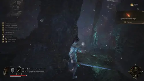 Поднимитесь по лестнице справа и заберите Лучистое красное перо, после уничтожения оперенного врага.