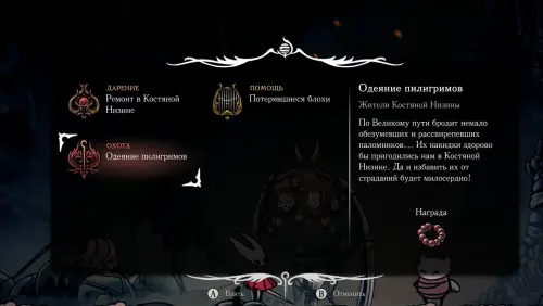 В Hollow Knight: Silksong игроку часто предстоит выполнять небольшие задания из раздела «охота», которые появляются в разных уголках Фарлума. Одна из первых таких миссий называется «Одеяние пилигримов». Она открывается после победы над Белкольным Зверем и связано с коллекционированием предметов, выпадающих из особых врагов. Несмотря на кажущуюся простоту, квест требует внимательности, повторяющихся боев и правильного выбора места для фарма.