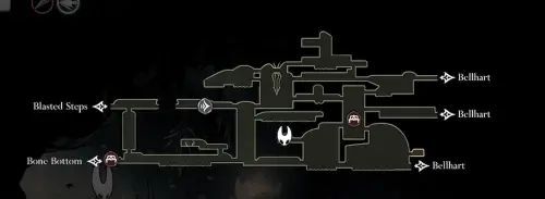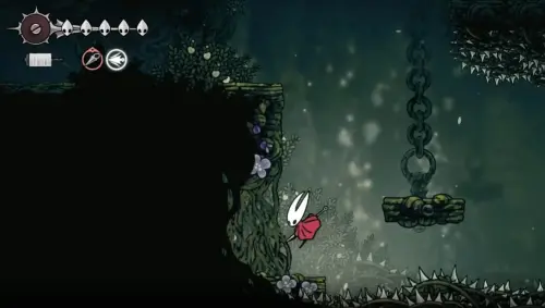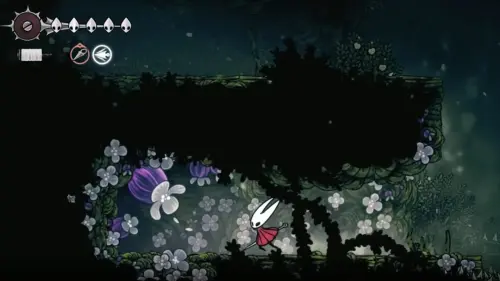 От ближайшей скамейки двигайтесь вниз и влево. Спускайтесь осторожно, пока не найдете проход вправо. Используйте плащ скитальца (если он у вас уже есть), чтобы плавно проскользить вниз. Продолжайте двигаться вправо и вверх, пока не увидите первый фиолетовый цветок. Уничтожьте его и получите Сердце.