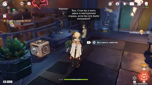 Снова подойдите к Демьяну и примитесь за создание третьего напитка. Вам предстоит выбрать следующие ингредиенты: лимон, мята и спиртное, а потом нажать кнопку «Смешать». Далее подойдите к столику клиентов, ведя за собой робота. Нужный гость сидит рядом с Нефер. После разговора возвратитесь к барной стойке.