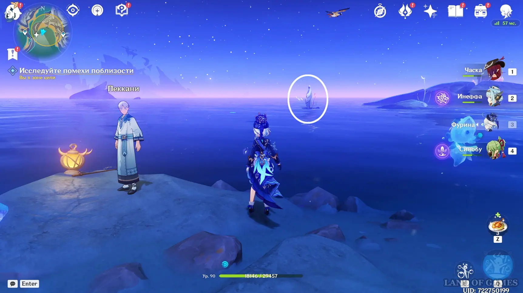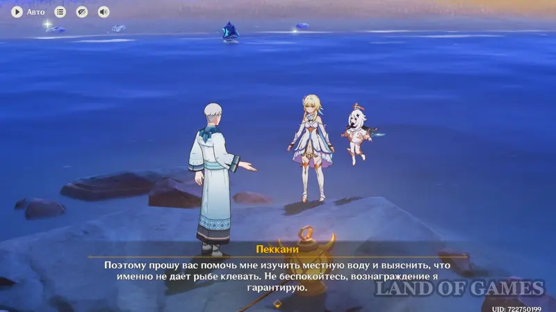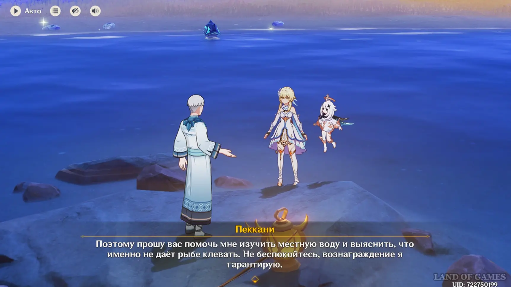 Под конец поручения вернитесь к рыбаку. Пеккани провозгласит нас избранниками Лунной Девы и одарит обещанным вознаграждением в размере 30-ти примогемов и 37 тысяч моры.