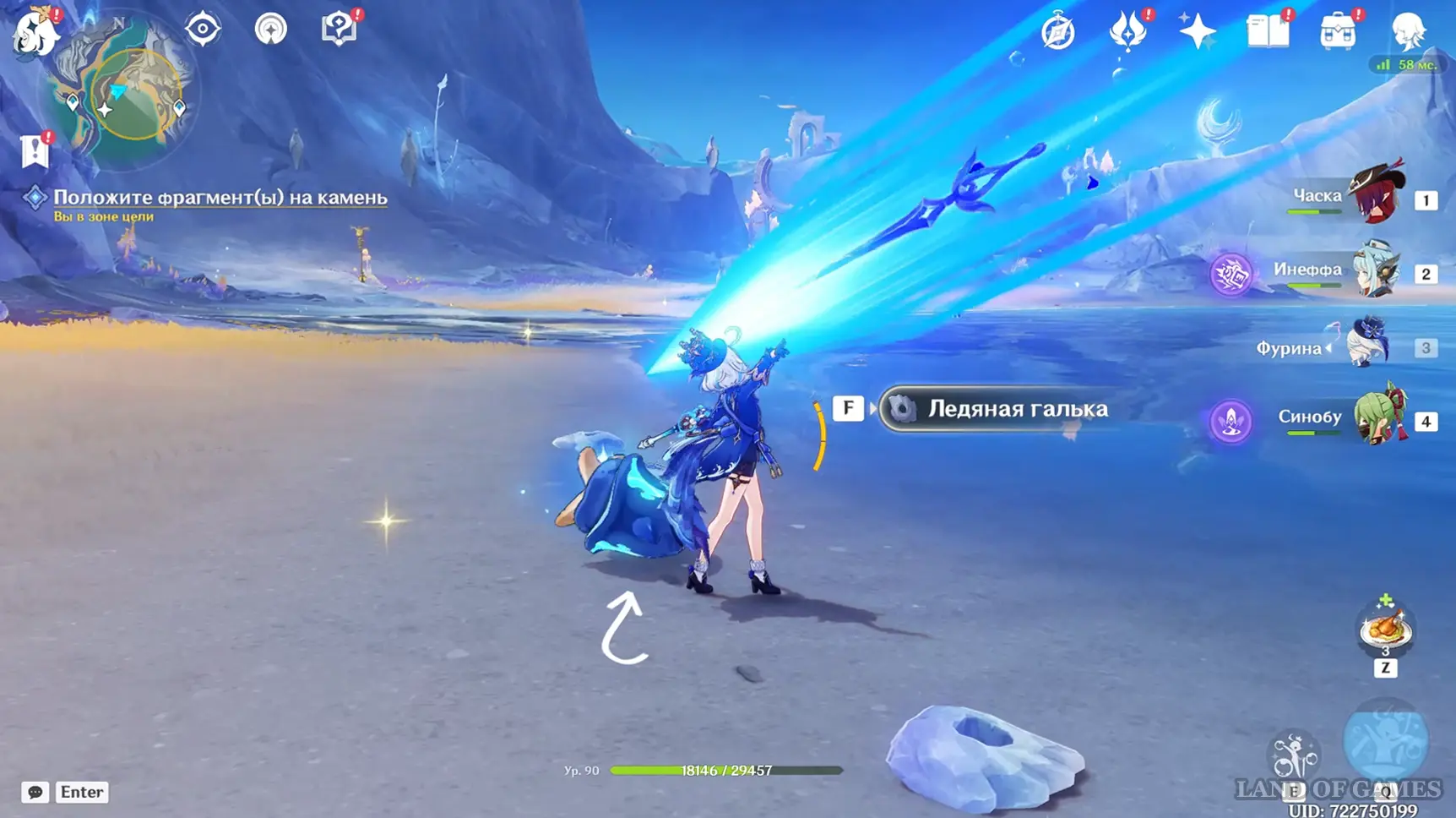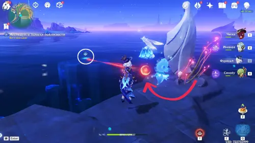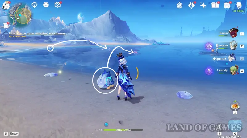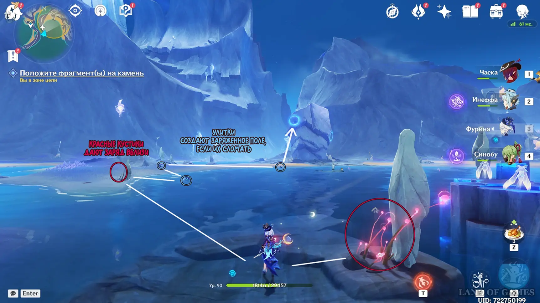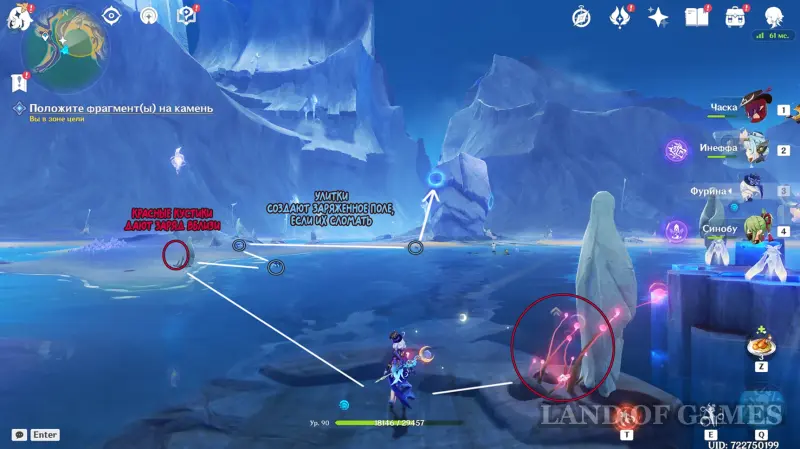 Его нужно донести до скалы по дугообразной береговой линии. Как только вы будете отходить от растений, осколок начнет падать, поэтому ваша задача — передвигаться от кустов у стартовой статуи к другим заряжающим героя объектам (например, к таким же кустам или раковинам, которые нужно ударить на месте, временно получив заряженный голубой сгусток). Траекторию передвижения, все объекты и процесс ломания улиток мы показали на скриншотах выше.