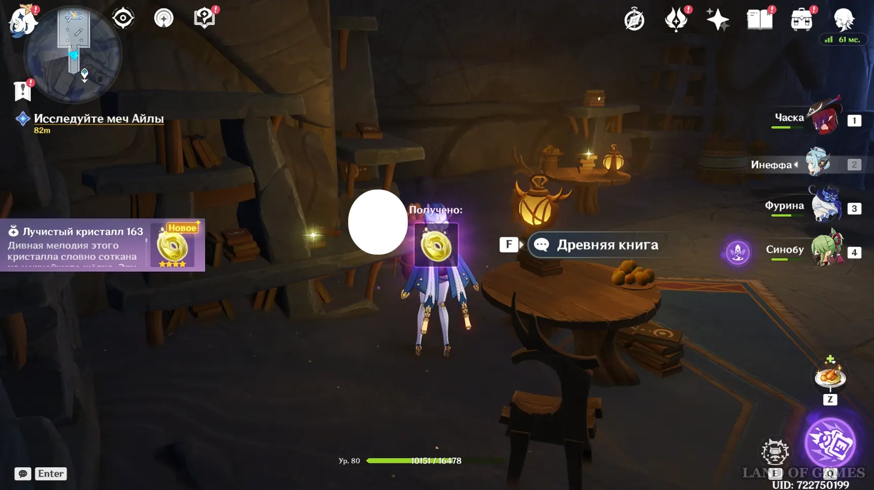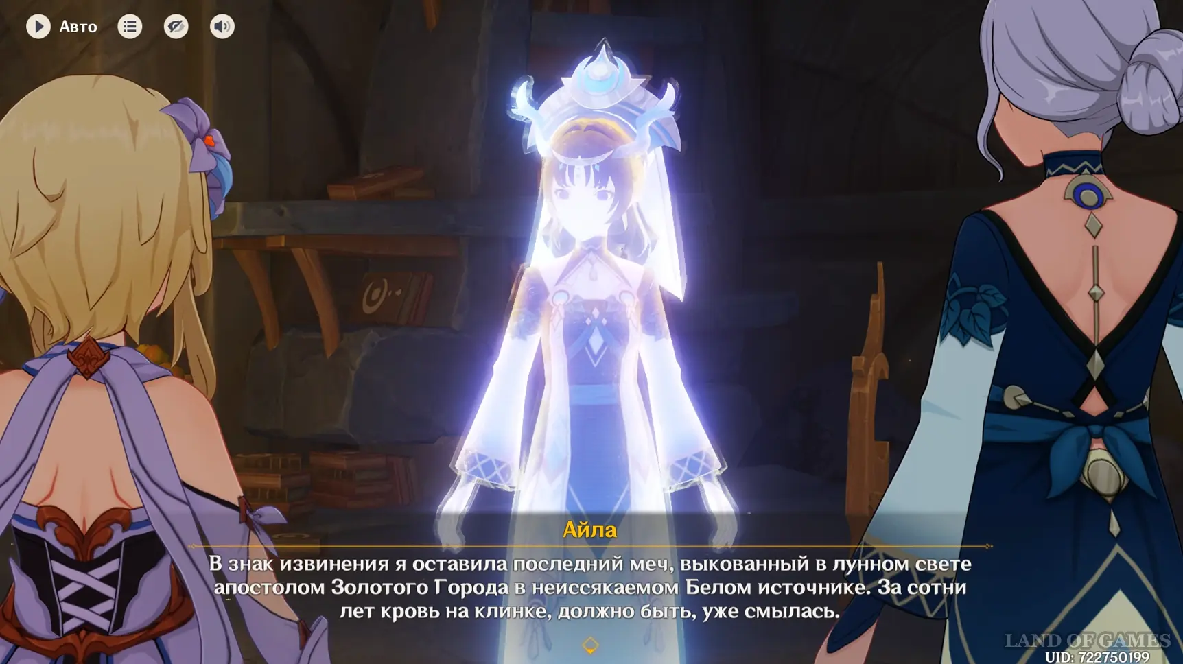 После общения с Айлой остается спуститься вниз и изучить подаренный ею меч «Рассвет прядильщицы луны», который после можно забрать с собой. Отметим, что в комнате, где мы общались с проекцией, есть множество интересных рукописей, а также Лучистый кристалл 163.
