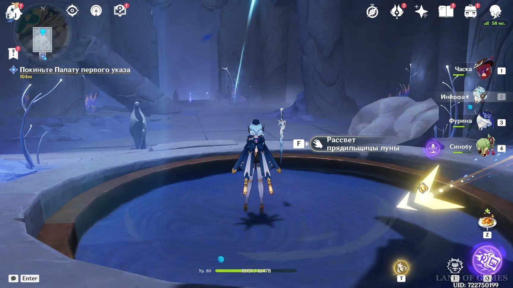 Внутри пройдите к неиссякаемому Белому источнику на севере Палаты и исследуйте его. Затем воспользуйтесь появившимся Лунным путем, поднимитесь к комнате на юге верхнего уровня локации и поговорить с Айлой.