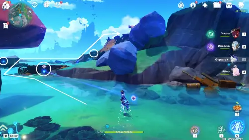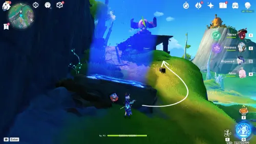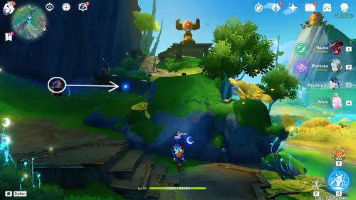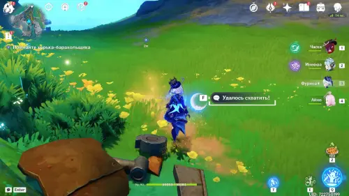 Обезоруженные зверьки пытаются сбежать — спускайтесь на полянку по центру долины и, нагнав передвигающегося под землей хорька, нажимайте «Удалось схватить!». После успешной попытки бегите за ним к месту, где уже ожидают Паймон и Ауни.