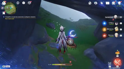 Далее вам нужно будет просто идти за зверьком, подобрав по пути мишень, обычный сундучок и 10 000 моры. Потом крот остановится рядом с каменной преградой. Поднимите снаряд, подойдите к нему и нажмите «Т», чтобы передать росу кроту. Наведите камеру на преграду и сломайте ее, снова нажав на «Т». Здесь вы обнаружите еще одну мишень.