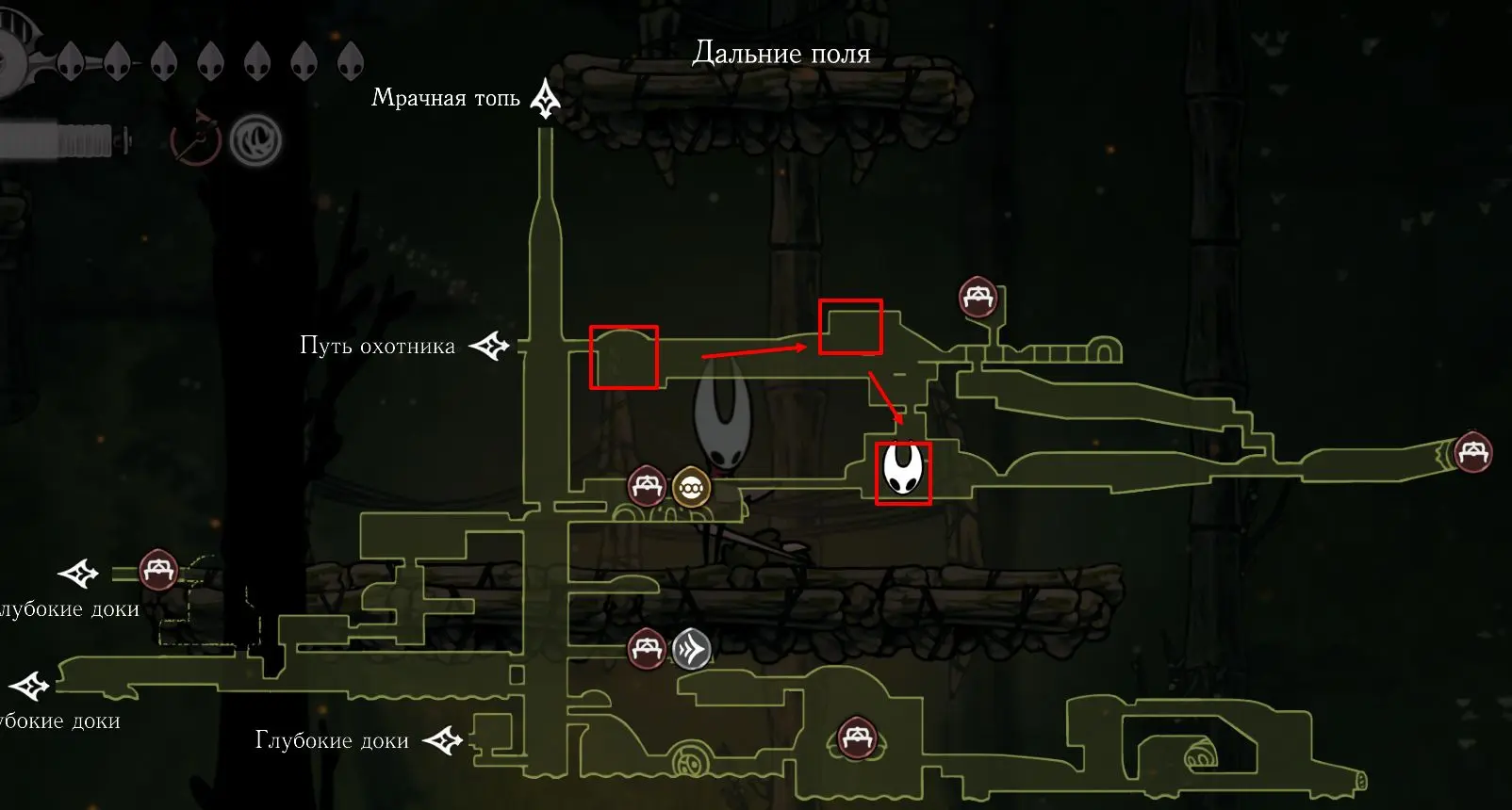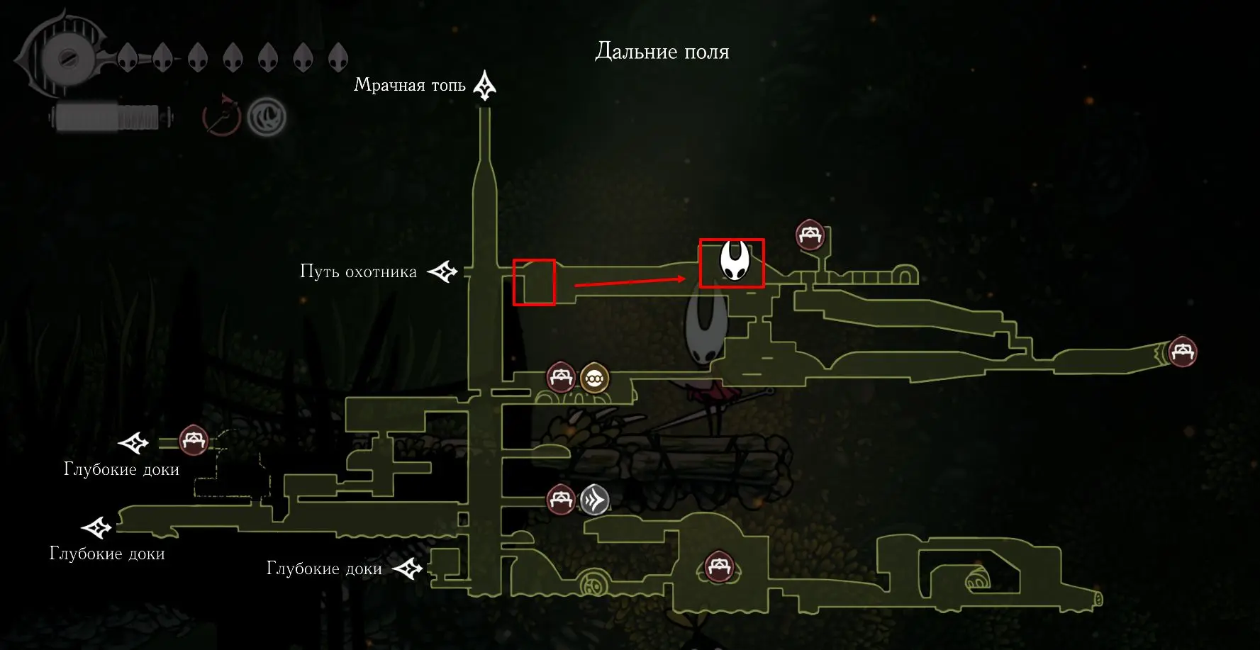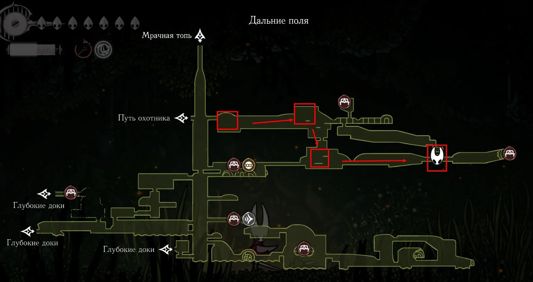 Пройдите немного направо и наткнетесь на первый след монстра. После продолжаем следовать за убегающей тенью, минуя красные шипы под ногами. В результате выйдем на соседнюю локацию — «Дальние поля». Дерните рычаг по пути, чтобы открыть быстрый проход на нижние уровни.