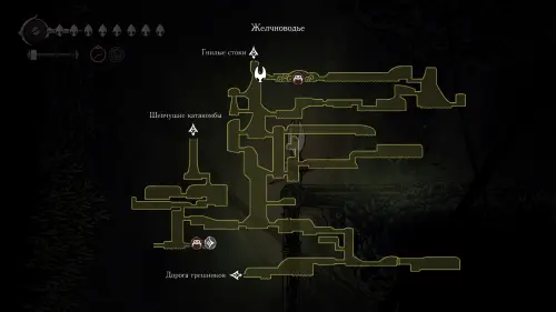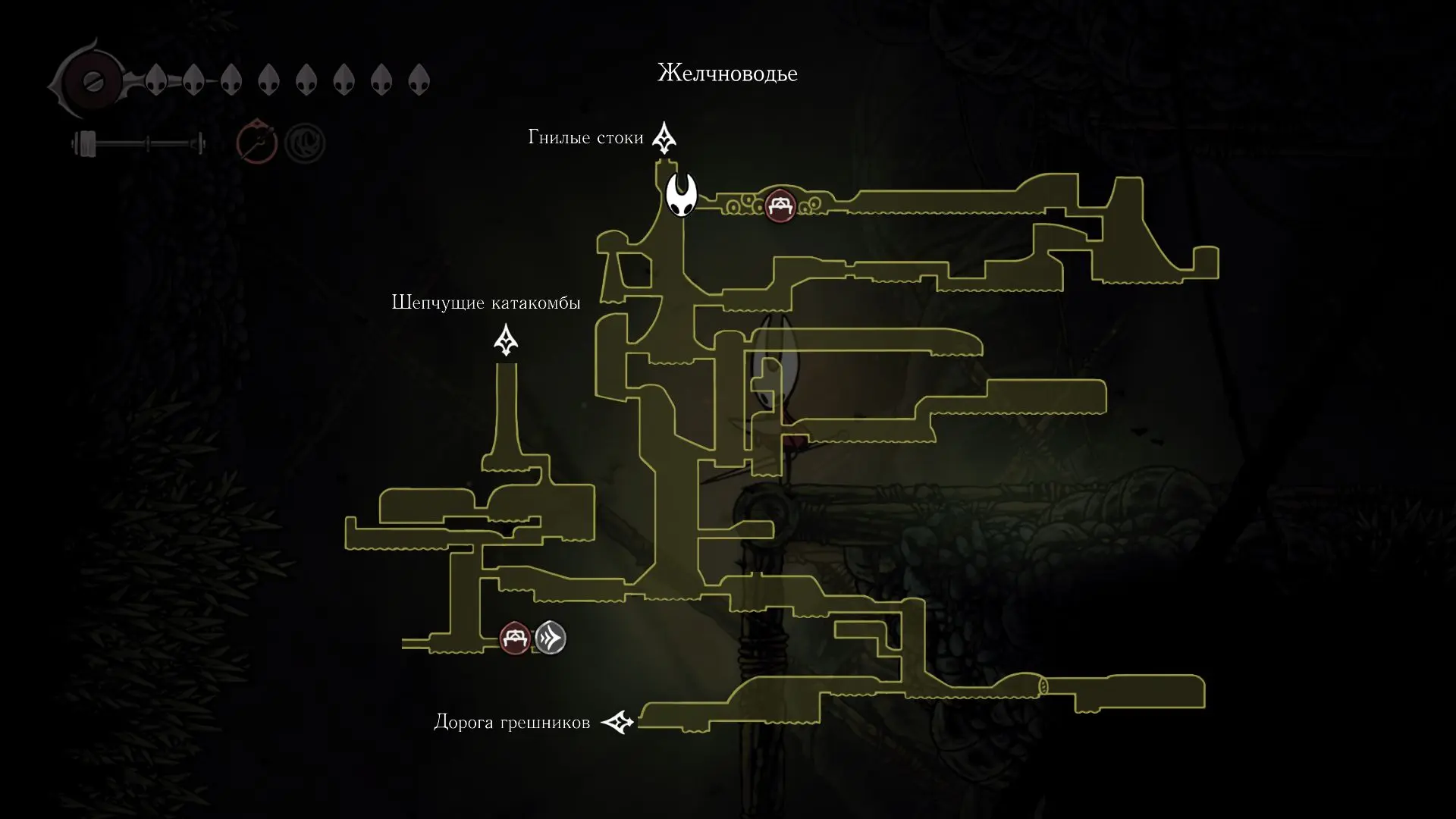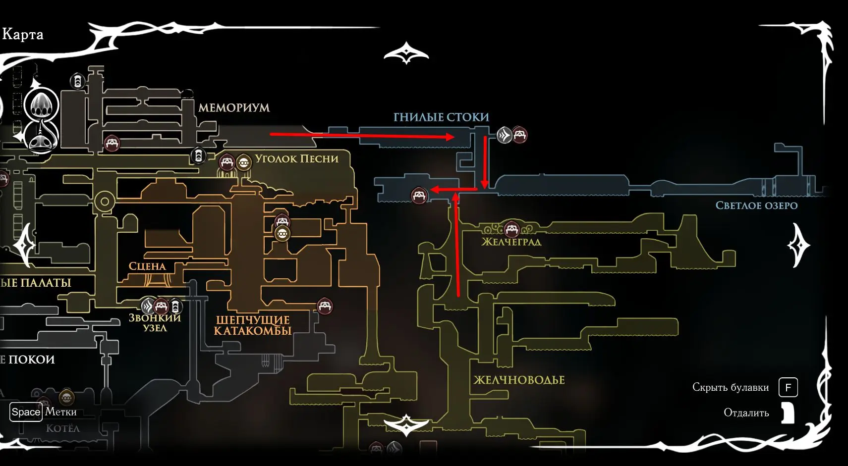 Если решили добираться другим способом, то продолжайте проходить игру, пока на локации «Желчноводье» не победите босса Гроала Великого и не откроете город «Желчеград». От скамейки выйдите налево в шахту и поднимитесь до верхнего перехода в «Гнилые стоки». Подниматься придется по отвесной стене, используя двойной прыжок и инструмент «Захват скалолаза».
