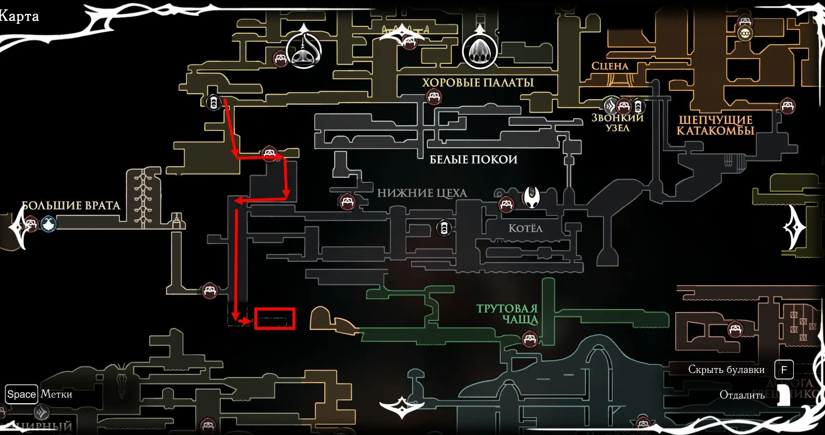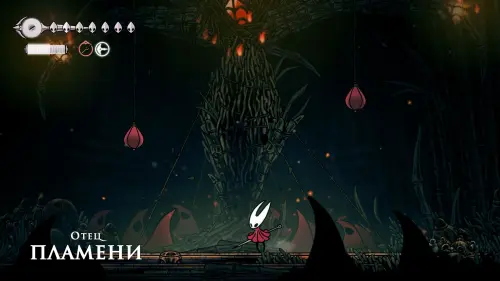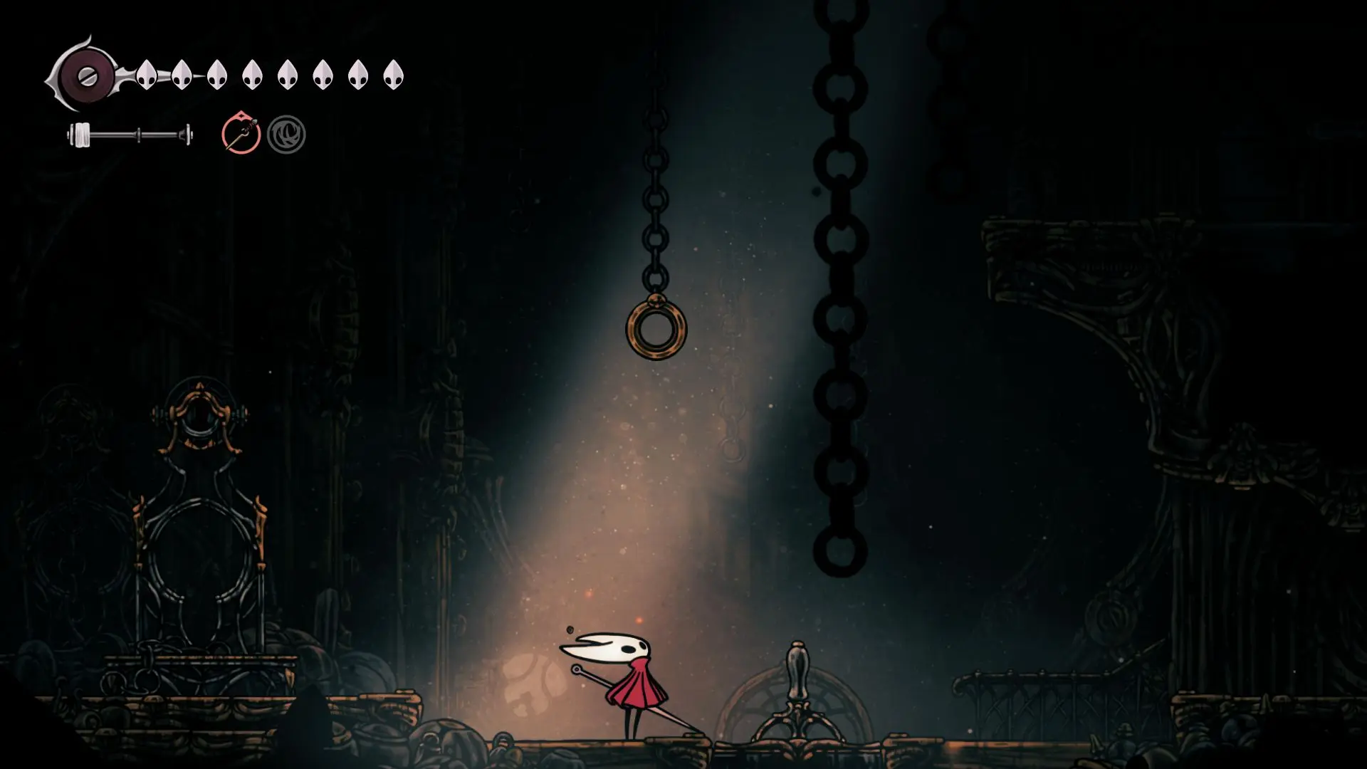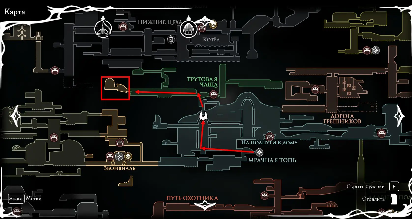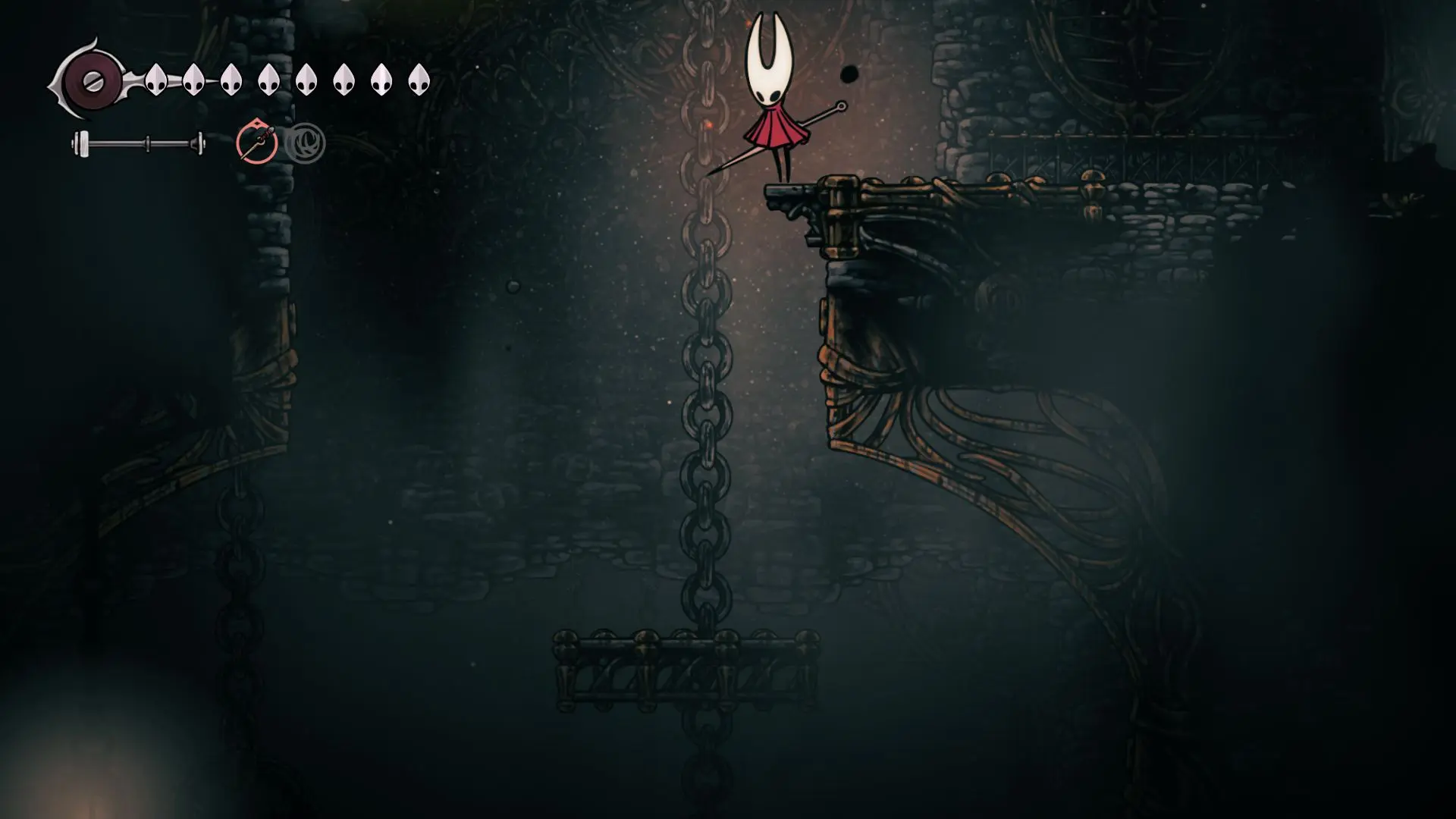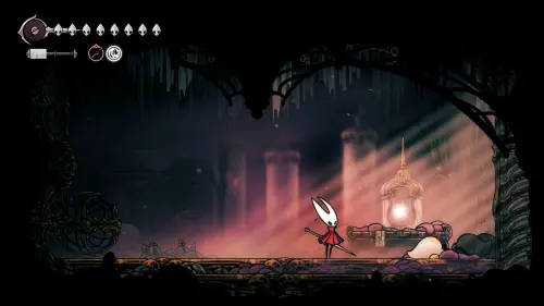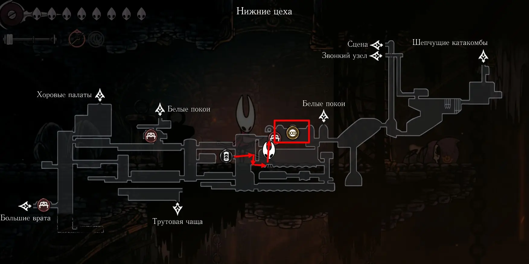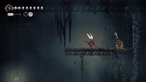 Отправляемся на локацию через лифт. Выходим направо к шахте и бьем по рычагу, чтобы создать мост. На другой стороне спуститесь вниз и выйдите в помещение с алтарем, где ранее забирали способность для Хорнет.