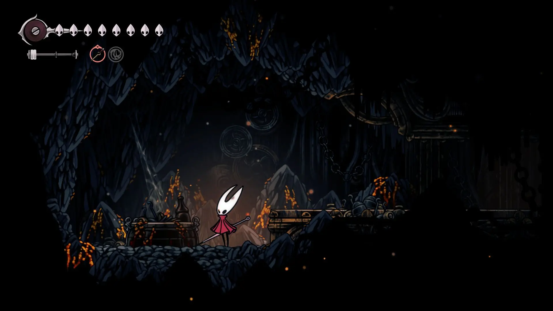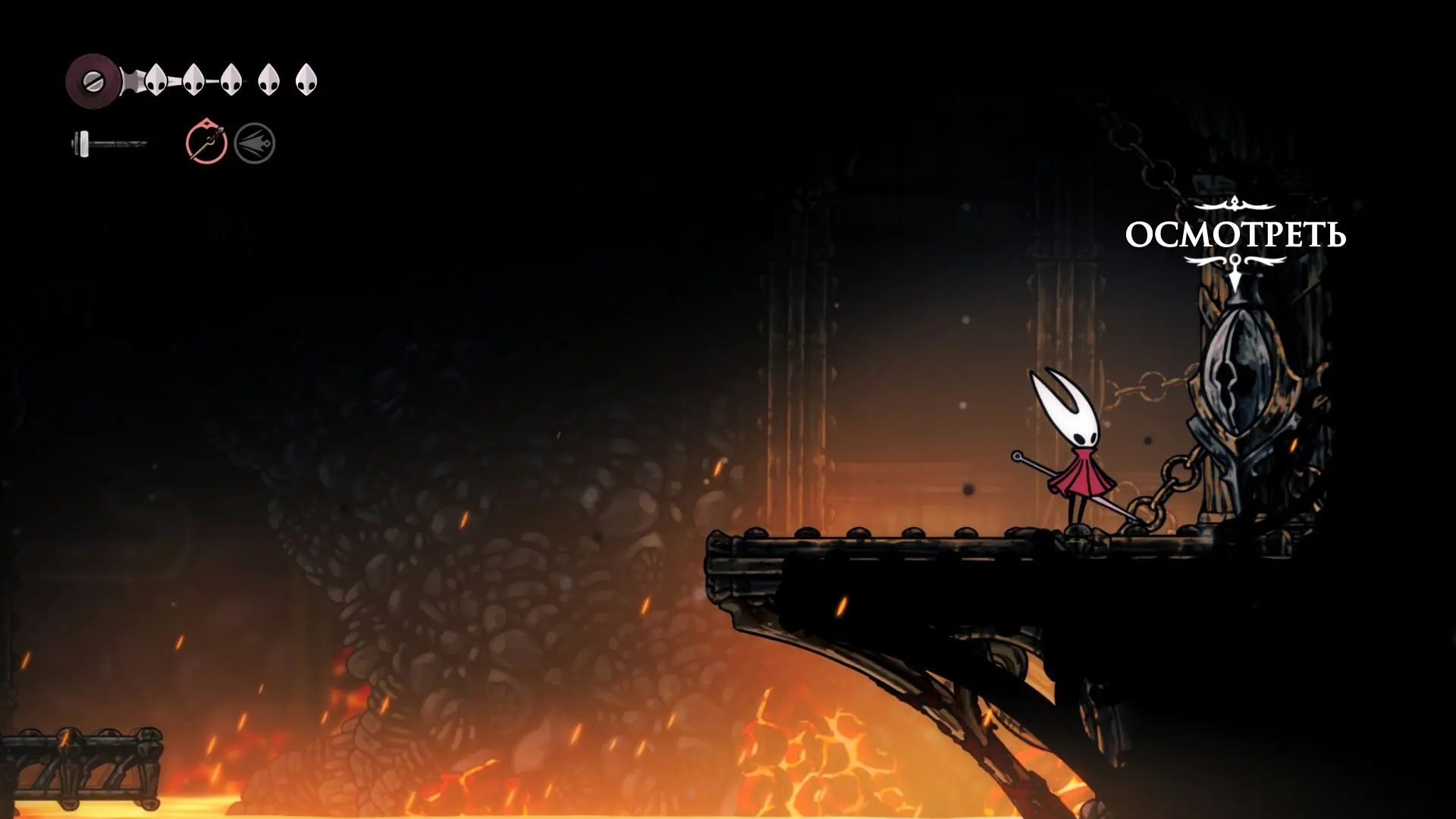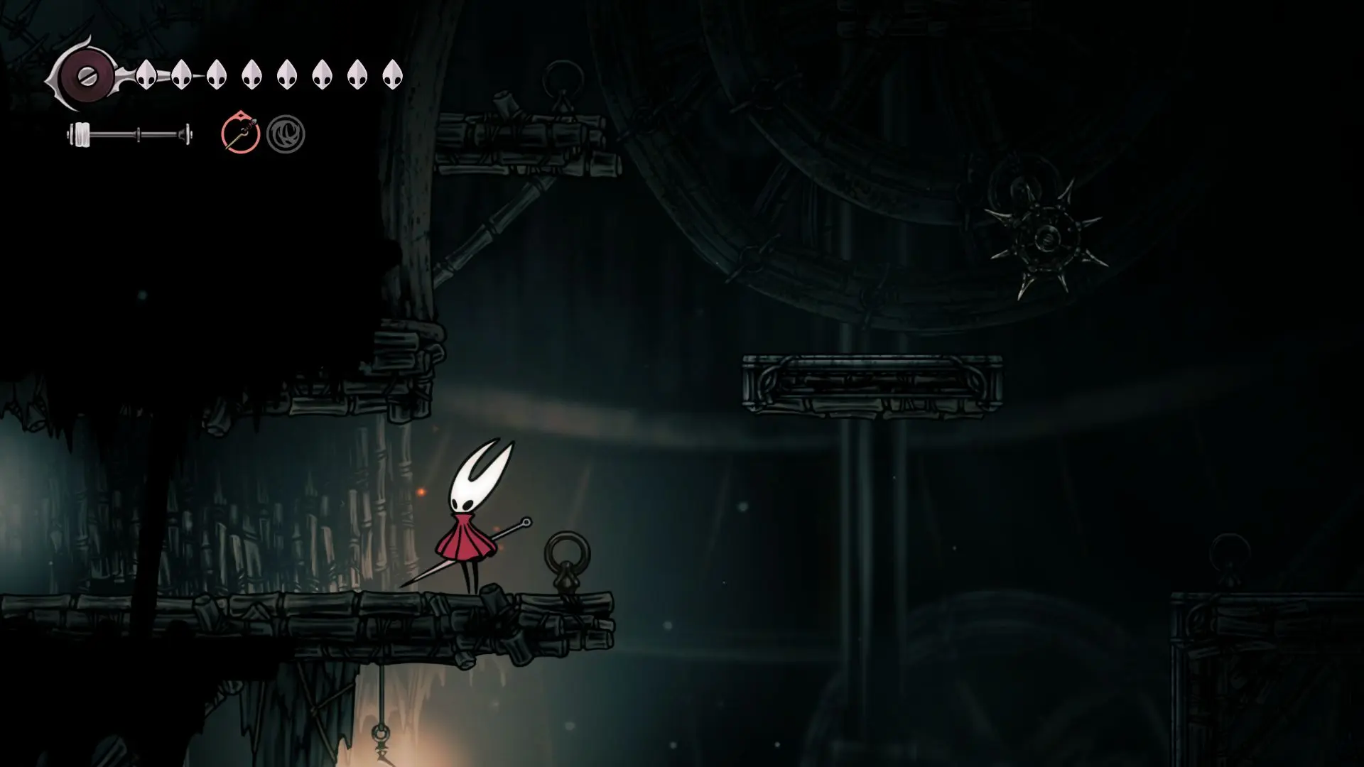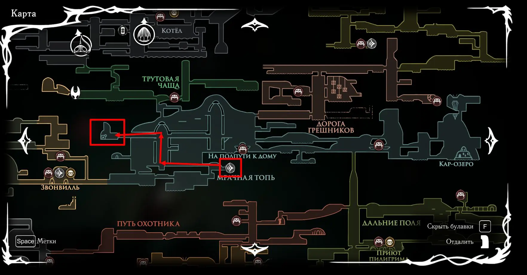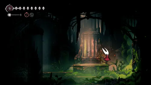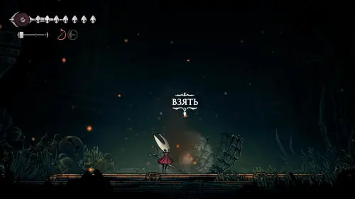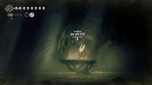Отправляемся на локацию через лифт. Выходим направо к шахте и бьем по рычагу, чтобы создать мост. На другой стороне спуститесь вниз и выйдите в помещение с алтарем, где ранее забирали способность для Хорнет.