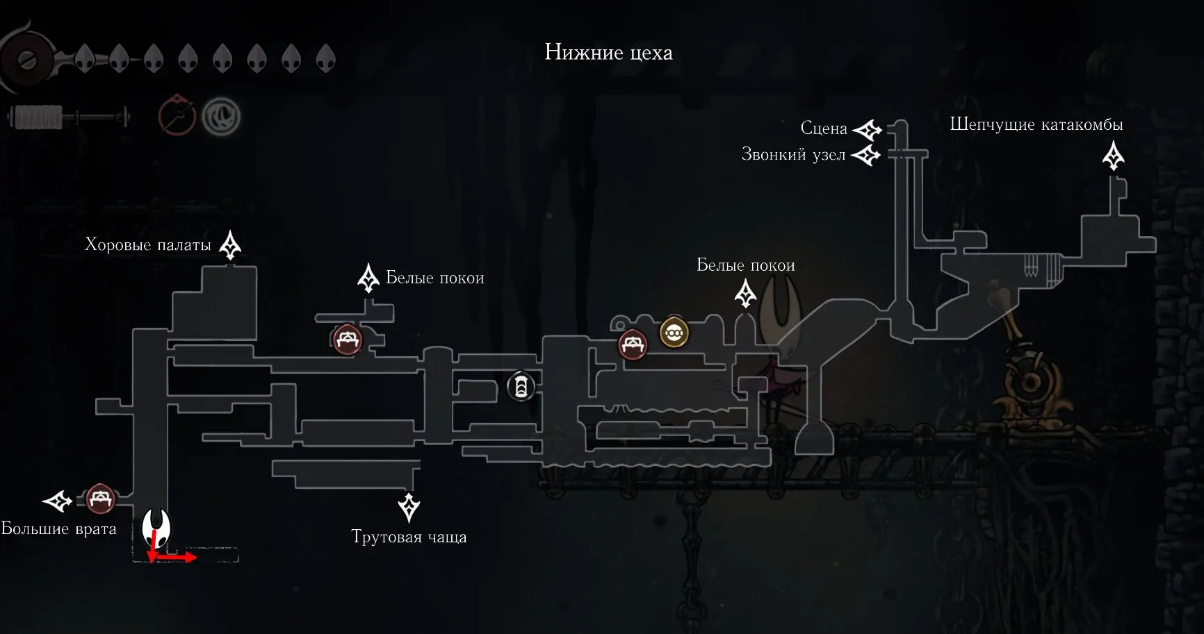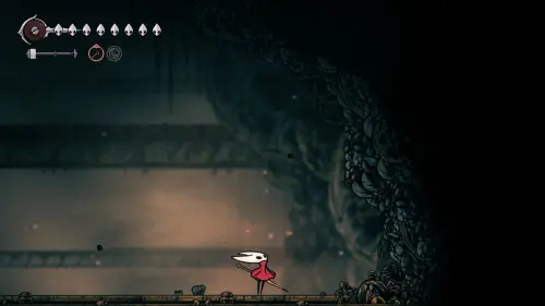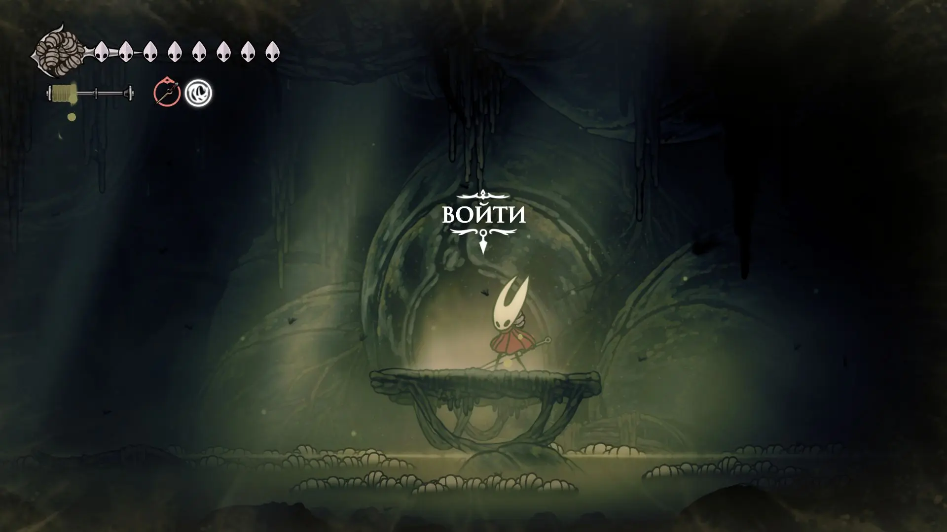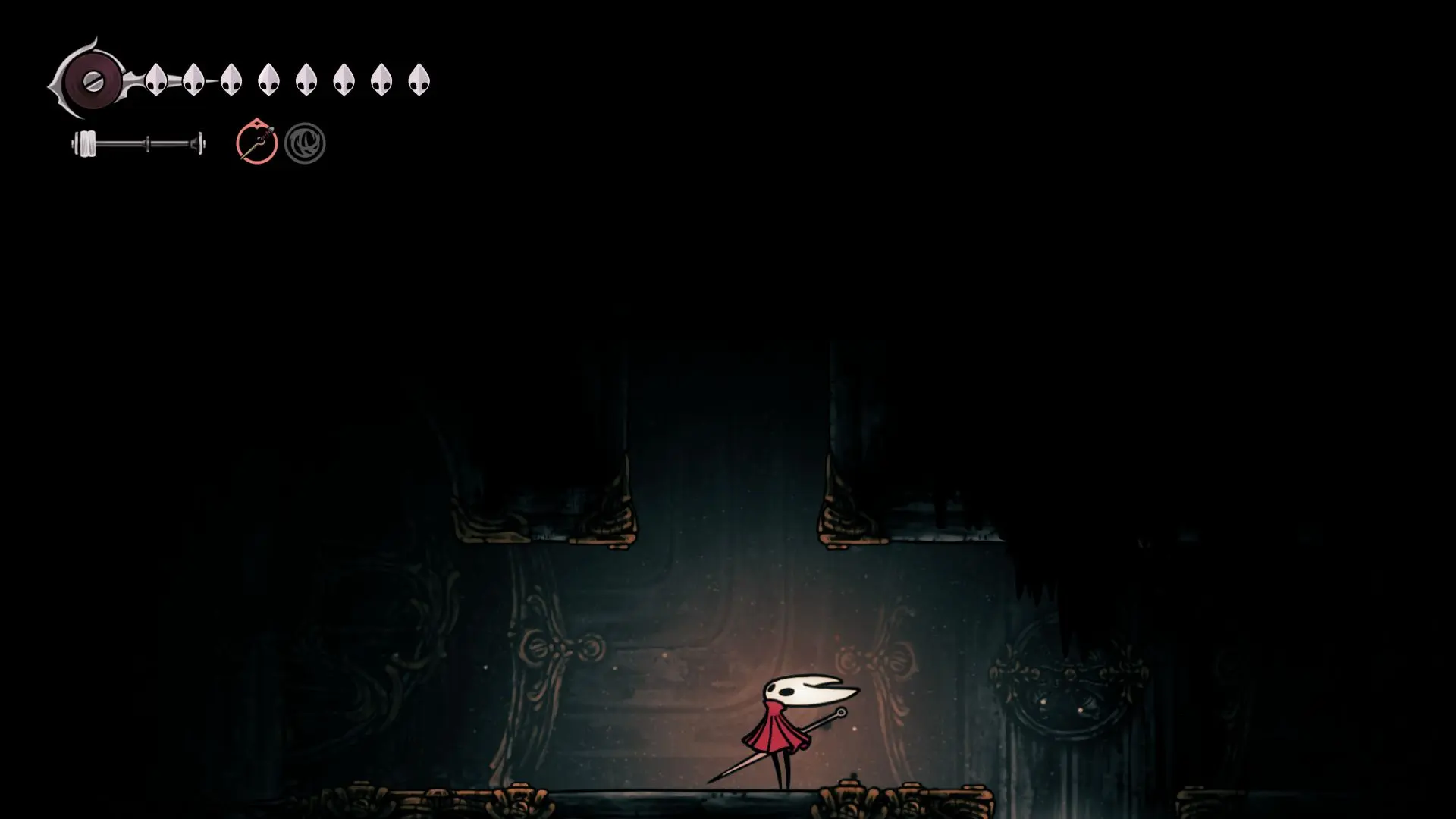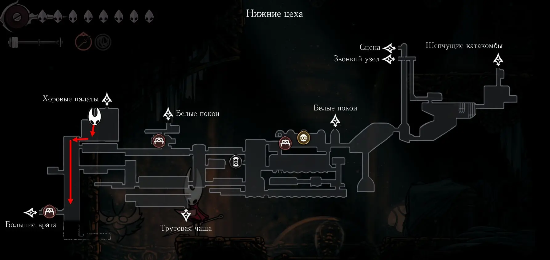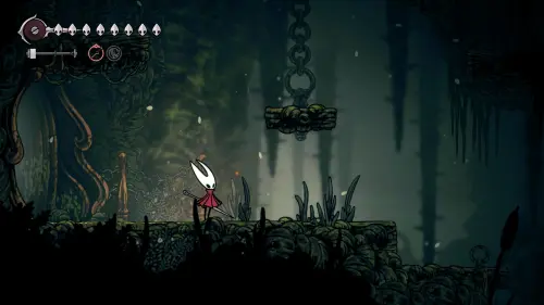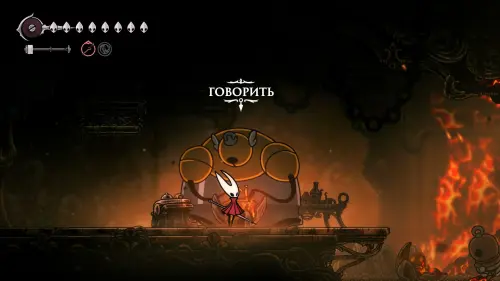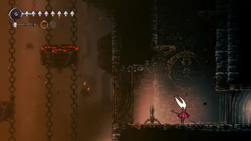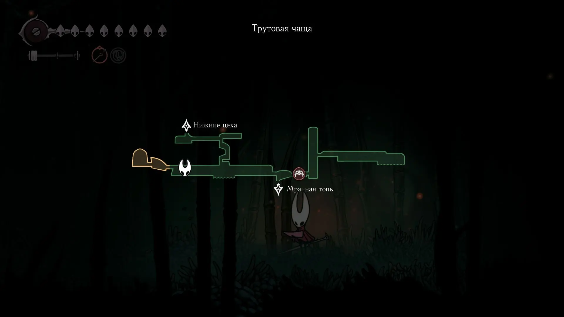 Отправляемся на локацию через лифт. Выходим направо к шахте и бьем по рычагу, чтобы создать мост. На другой стороне спуститесь вниз и выйдите в помещение с алтарем, где ранее забирали способность для Хорнет.