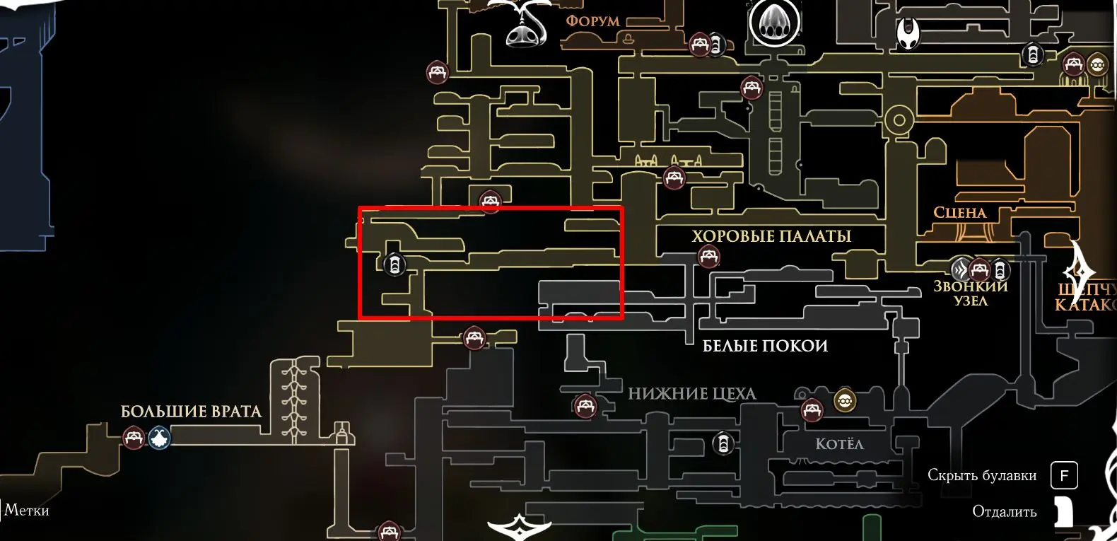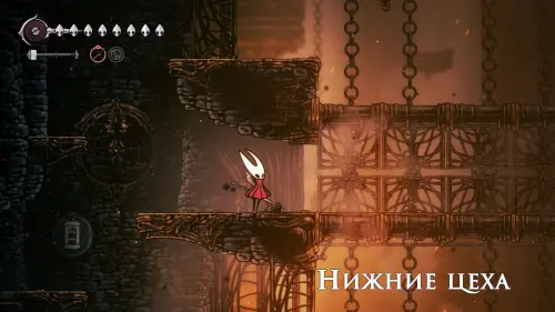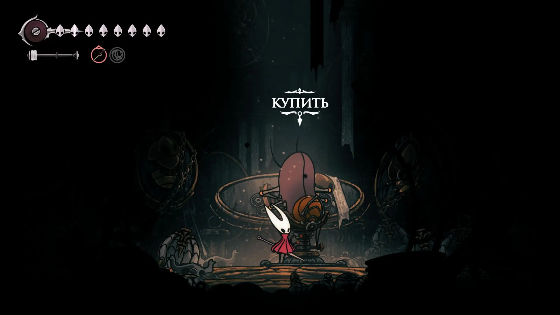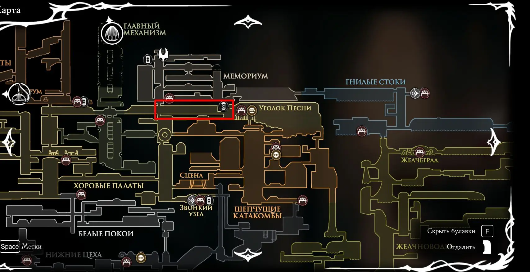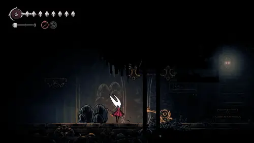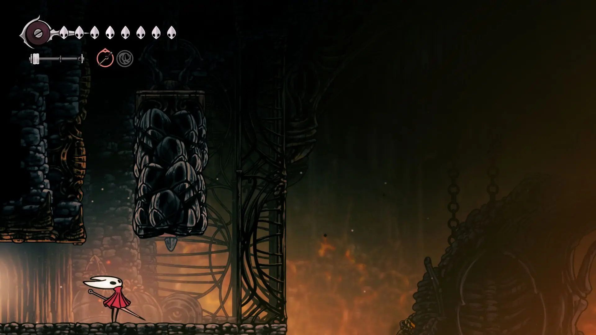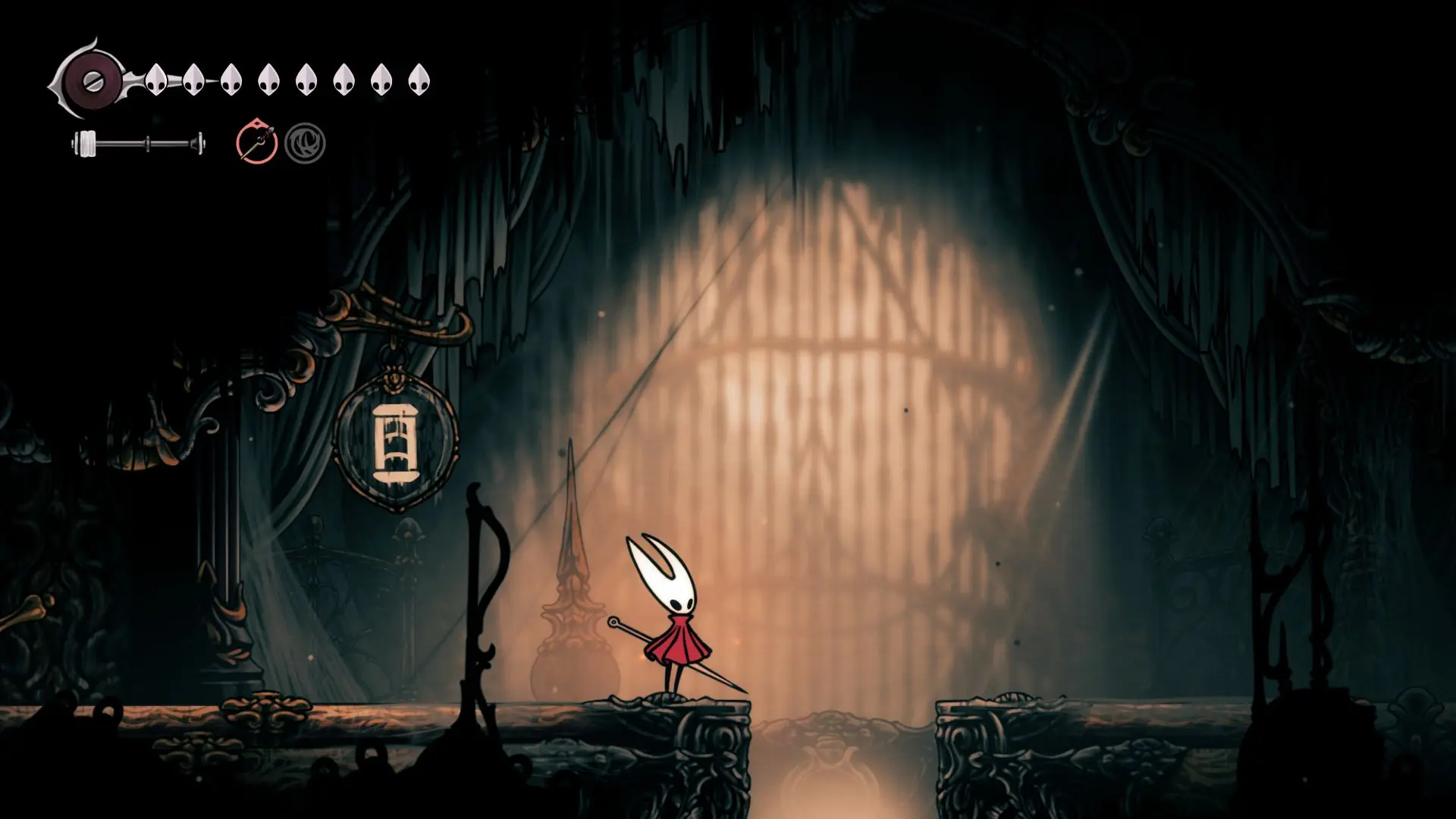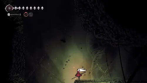 Отправляемся на локацию через лифт. Выходим направо к шахте и бьем по рычагу, чтобы создать мост. На другой стороне спуститесь вниз и выйдите в помещение с алтарем, где ранее забирали способность для Хорнет.