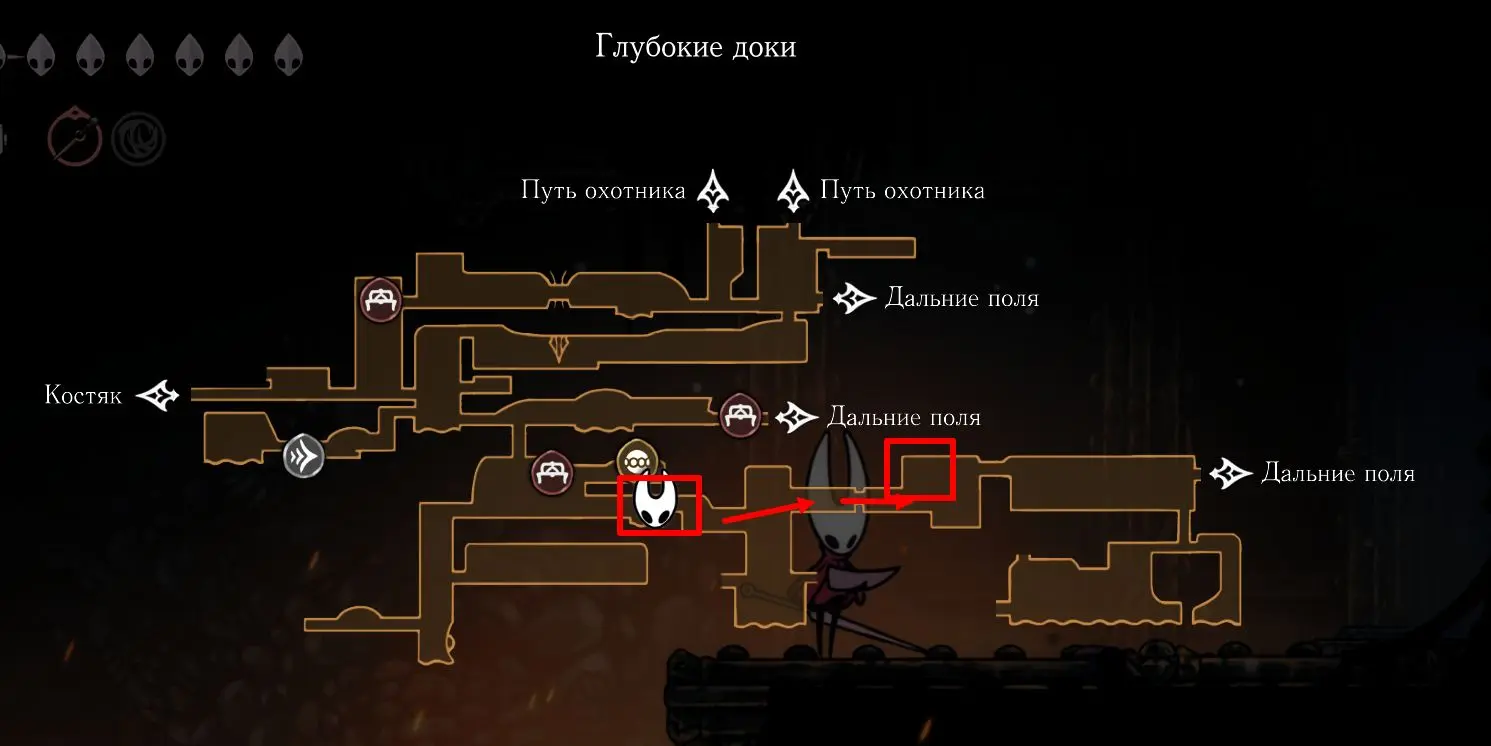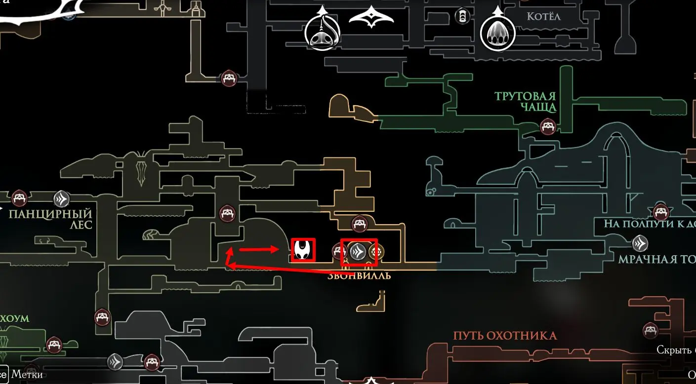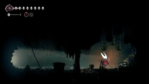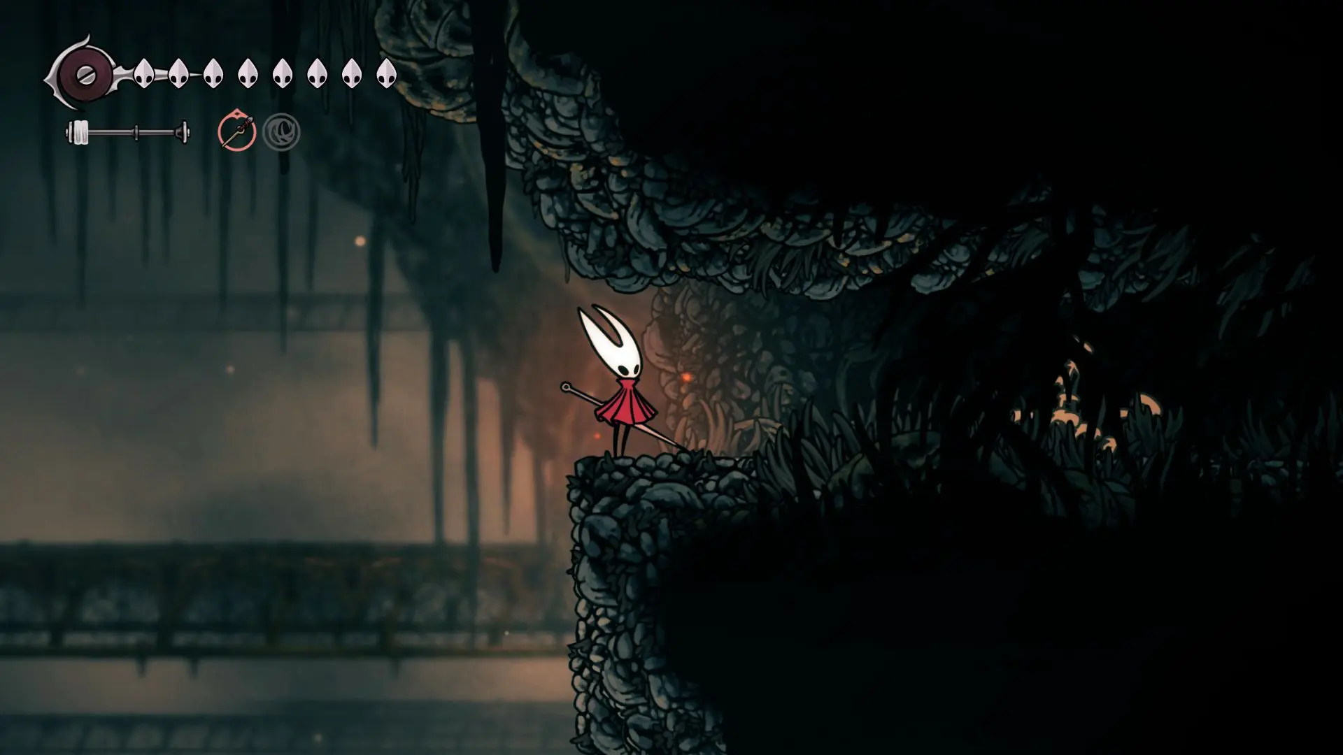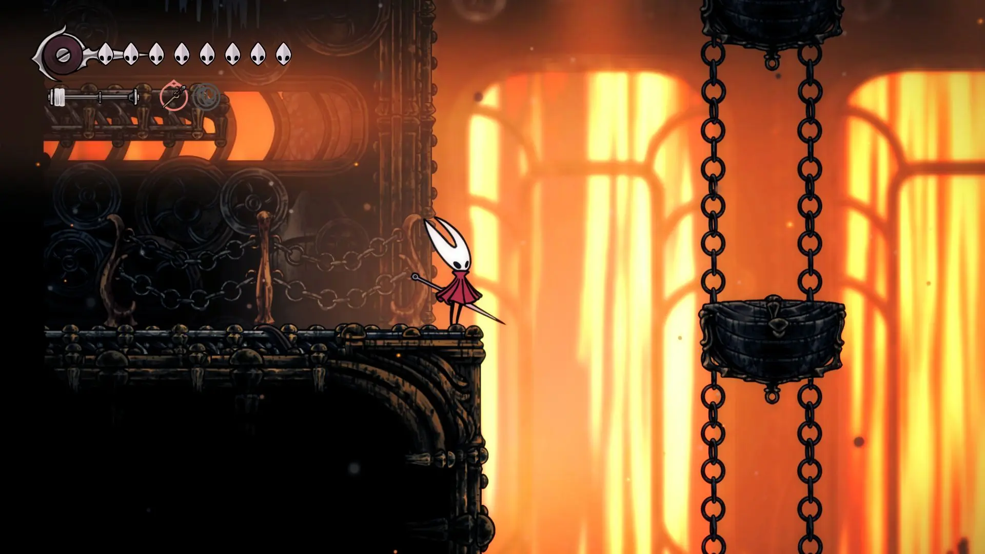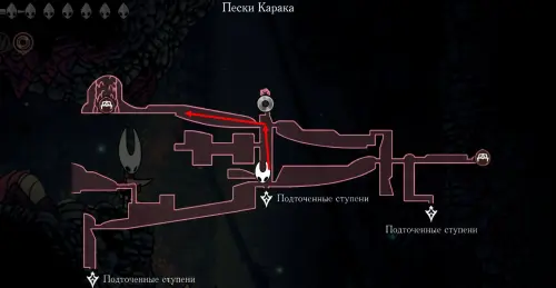 Отправляемся на локацию через лифт. Выходим направо к шахте и бьем по рычагу, чтобы создать мост. На другой стороне спуститесь вниз и выйдите в помещение с алтарем, где ранее забирали способность для Хорнет.
