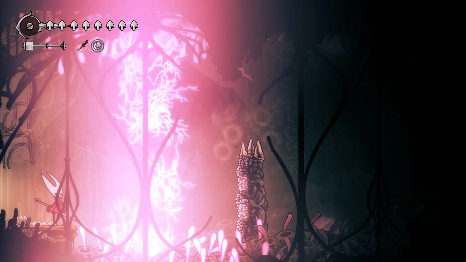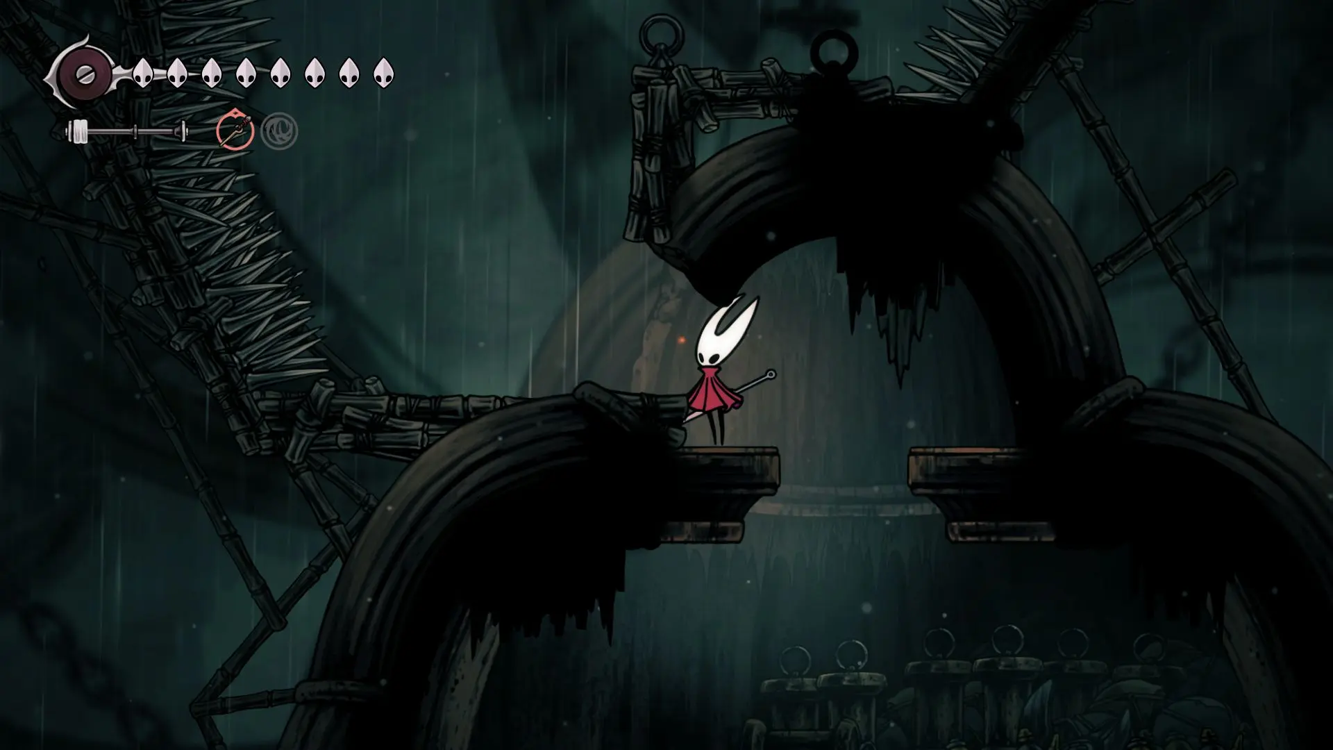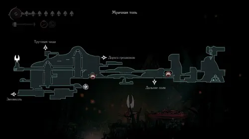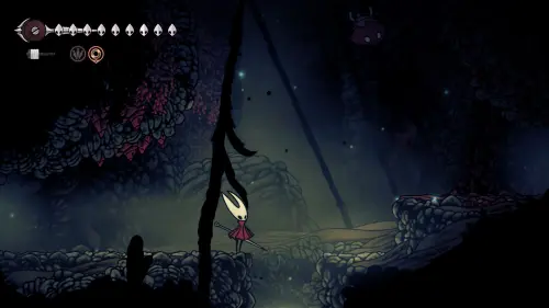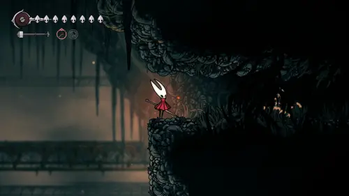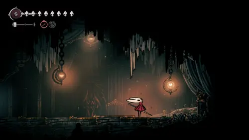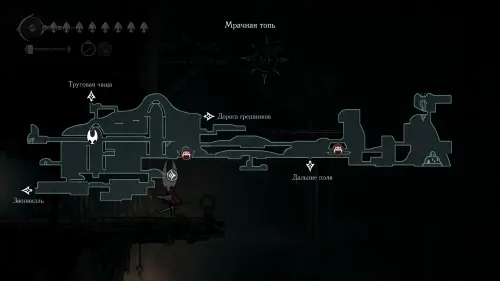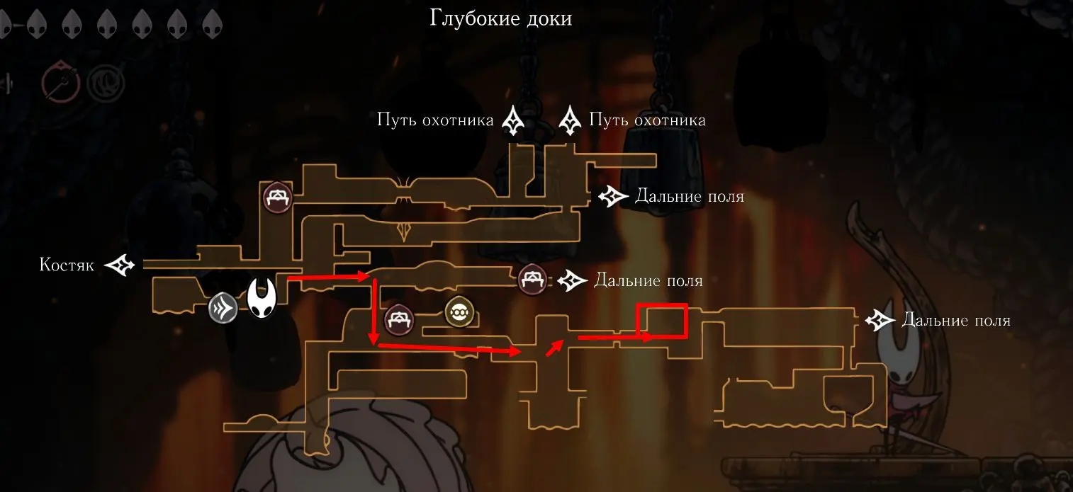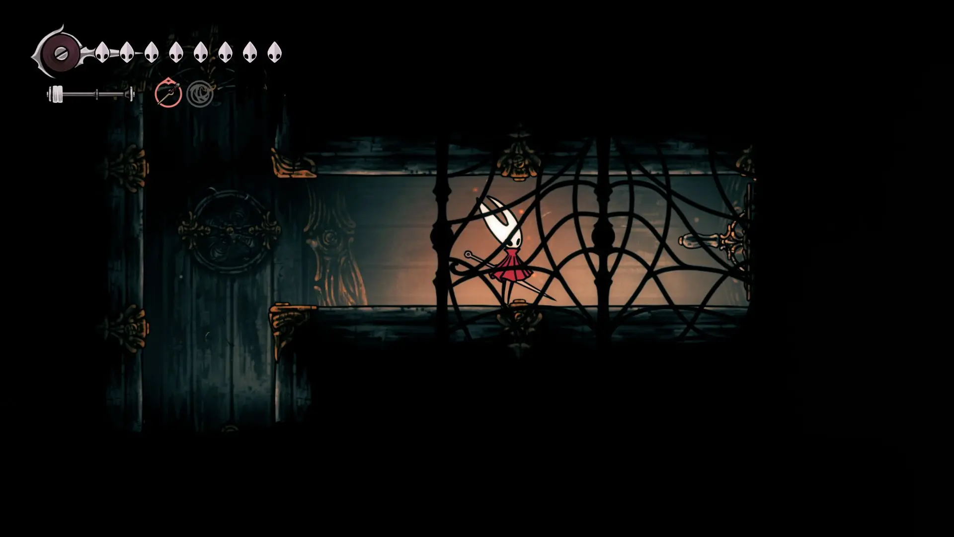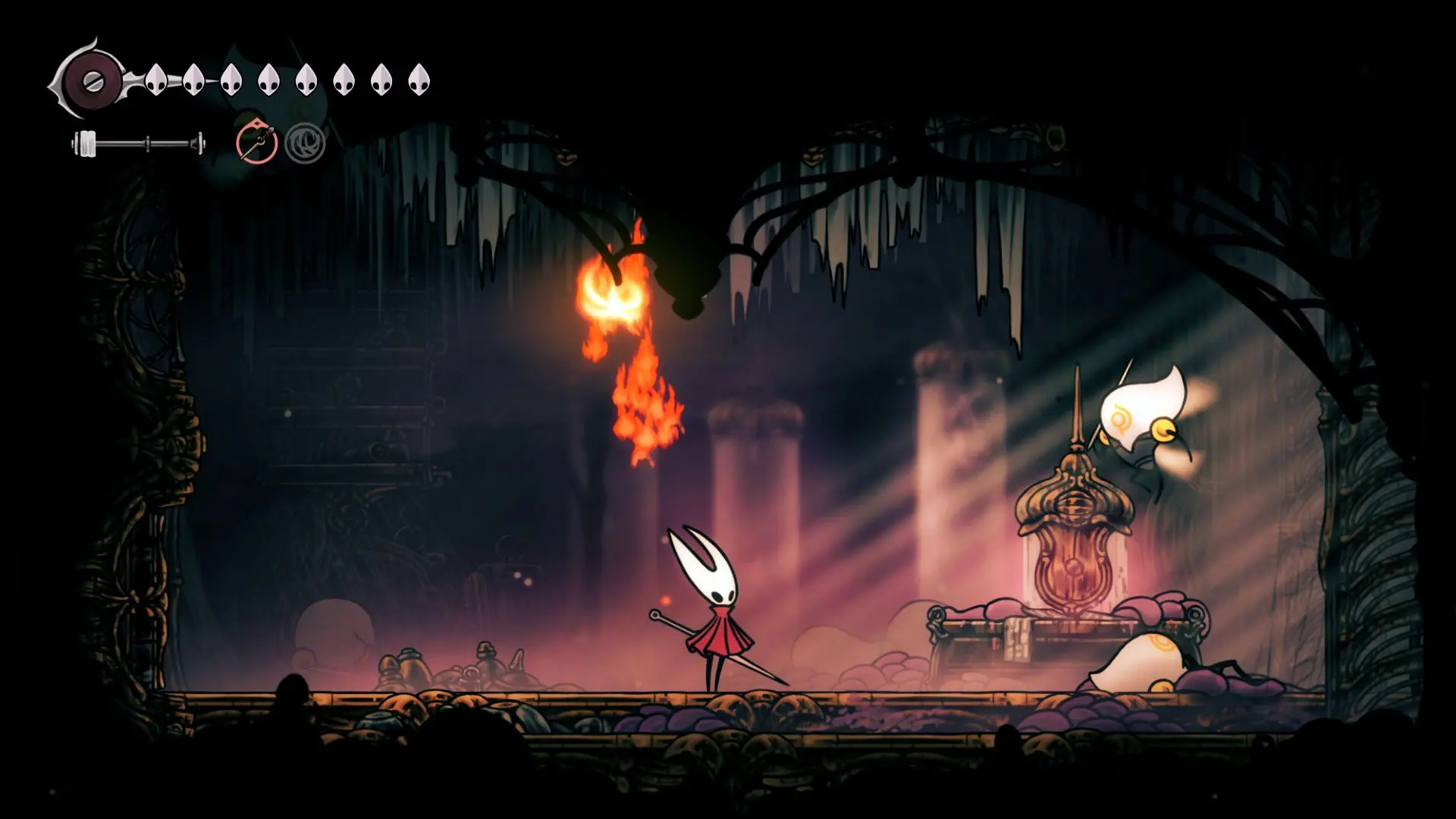 Отправляемся на локацию через лифт. Выходим направо к шахте и бьем по рычагу, чтобы создать мост. На другой стороне спуститесь вниз и выйдите в помещение с алтарем, где ранее забирали способность для Хорнет.