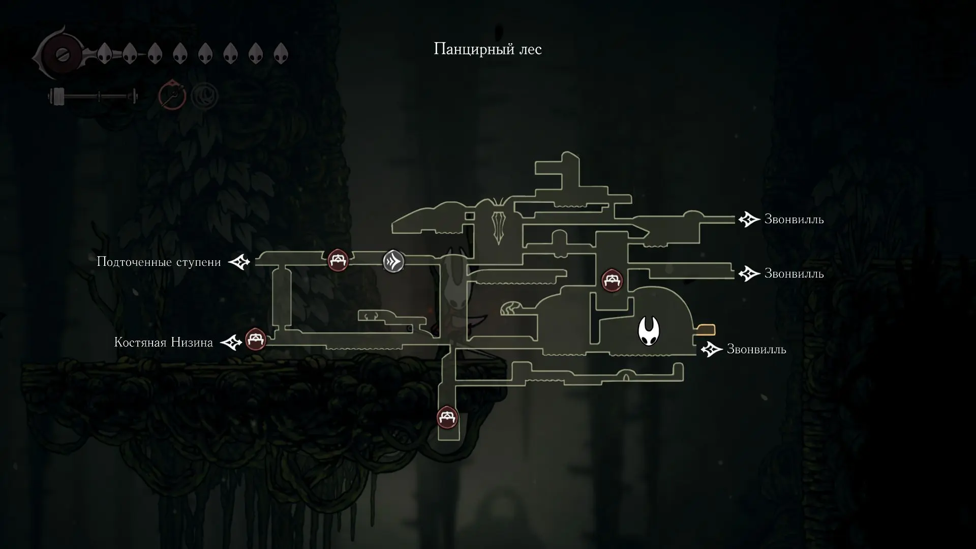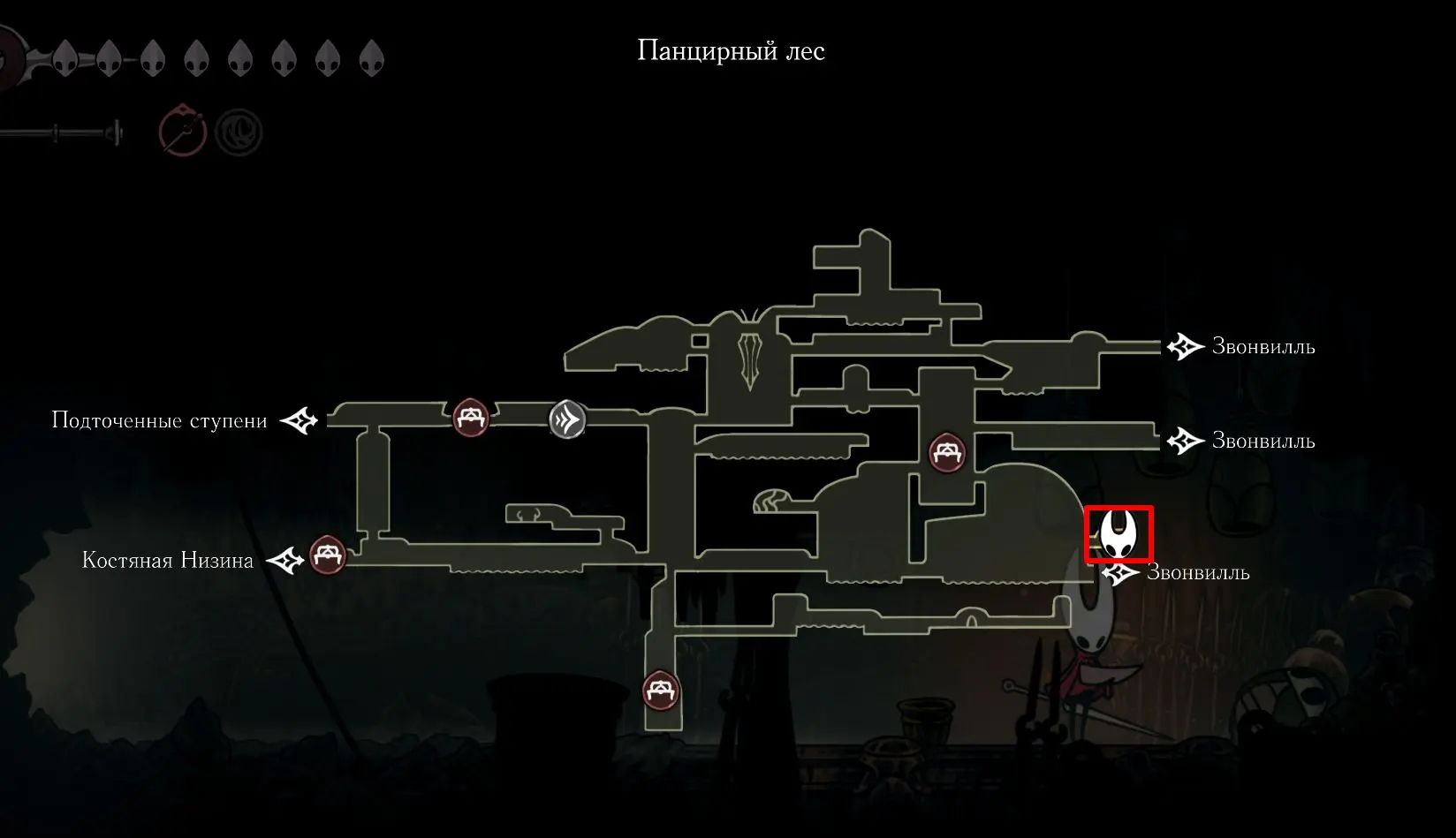 Снаряжение лежит в секретной комнате, в которую можно попасть через «Панцирный лес». Отправляемся на станцию «Звонвилля» и оттуда проходим налево — в соседнюю локацию. Сразу подняться к секретному проходу не получится. Сначала придется пройти по воде в левую сторону, пока не сможем подняться на мостик.