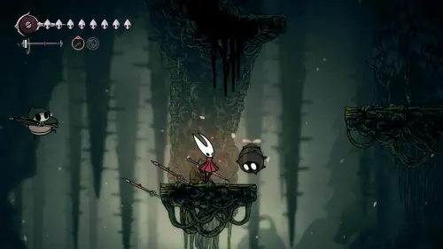 Наиболее короткий путь лежит через «Подточенные ступени». Со станции идем налево и поднимаемся на самый верх до перехода на нужную локацию. Там снова забираемся на вершину. Имейте ввиду, что для подъема потребуется не только цепкий захват с иглой, но и двойной прыжок.