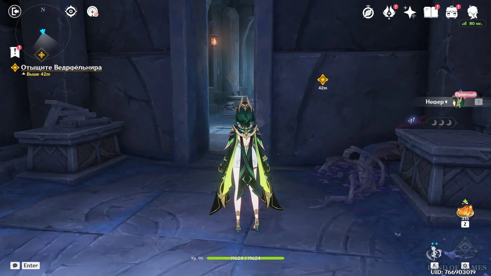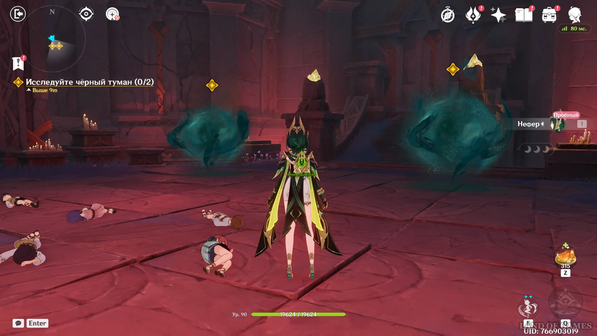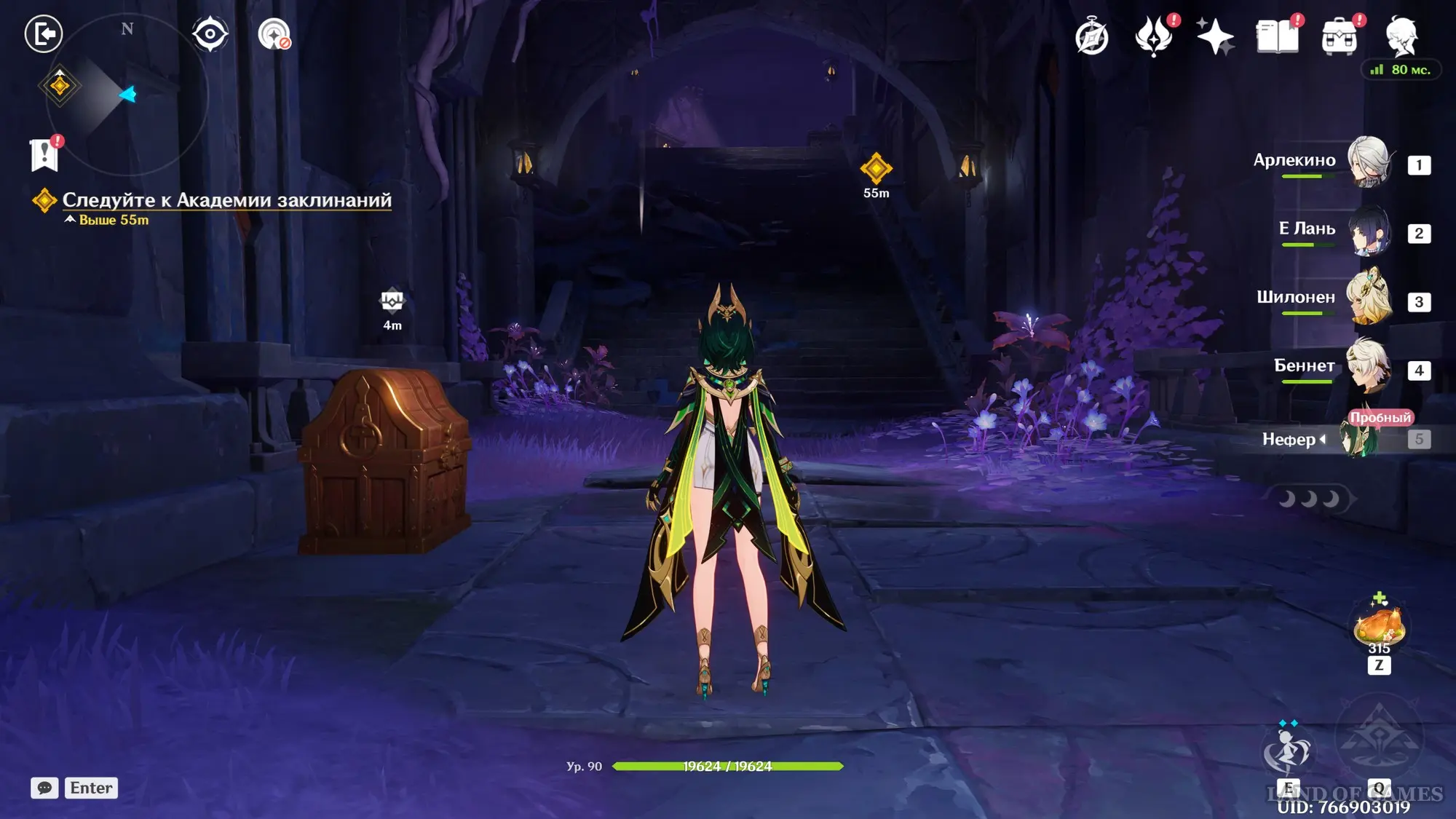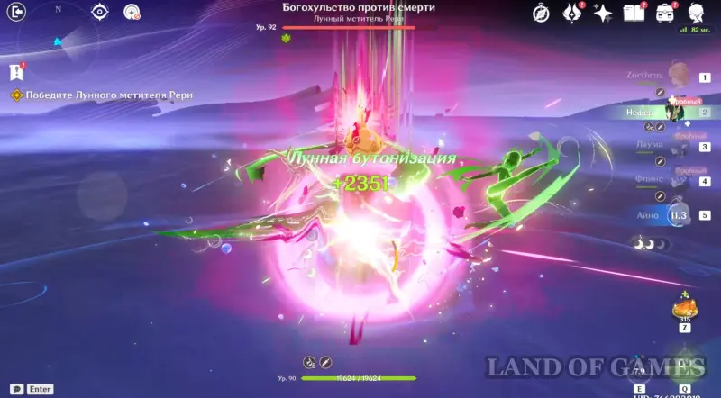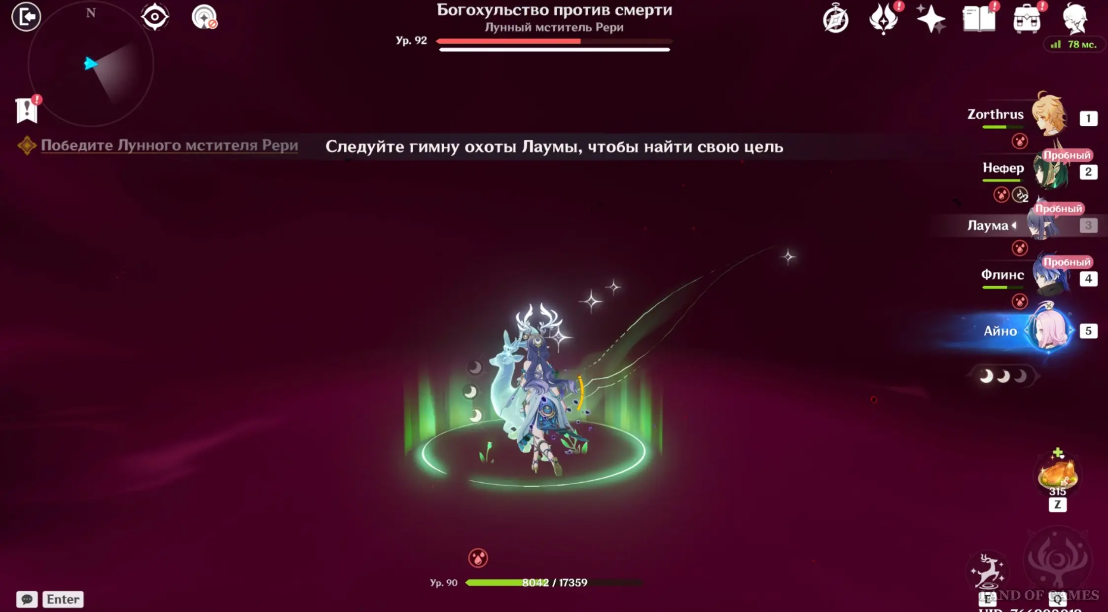 Далее используйте элементальное умение Лаумы, чтобы начать создавать Зеленую росу. Набрав хотя бы 2-3 штуки, переключитесь на Нефер и активируйте ее Е-шку, а потом примените три усиленные заряженные атаки. Снова примените Е-шку и еще раз бейте тремя ЗА. После этого можете переключиться на Флинса и бить его ультой, пока остальные перезаряжают свои умения.