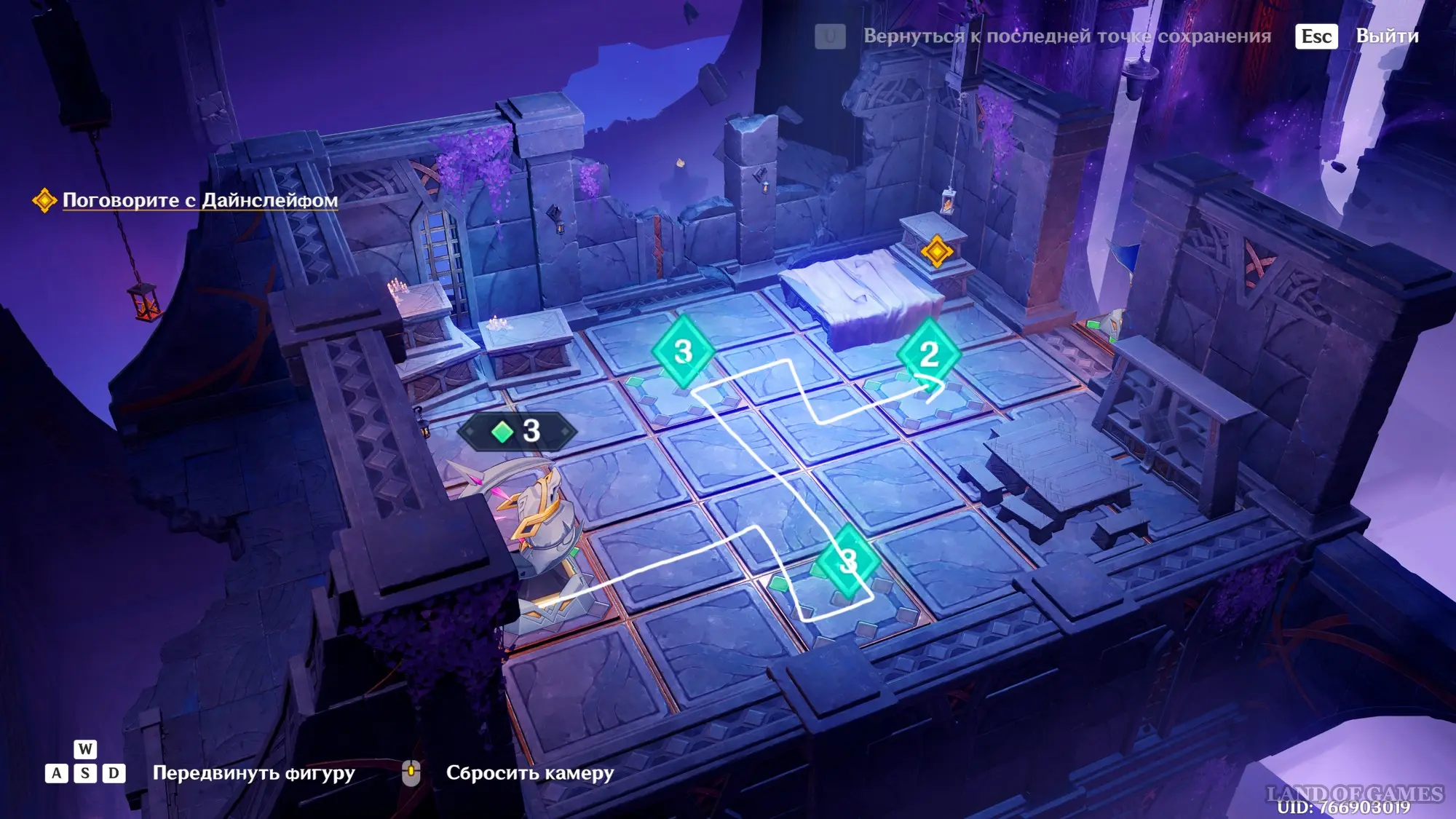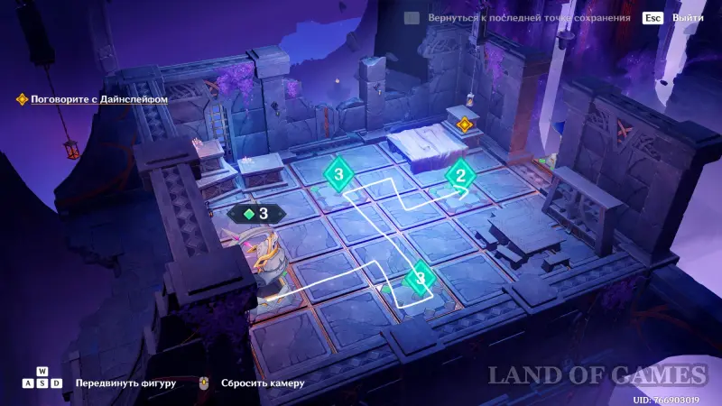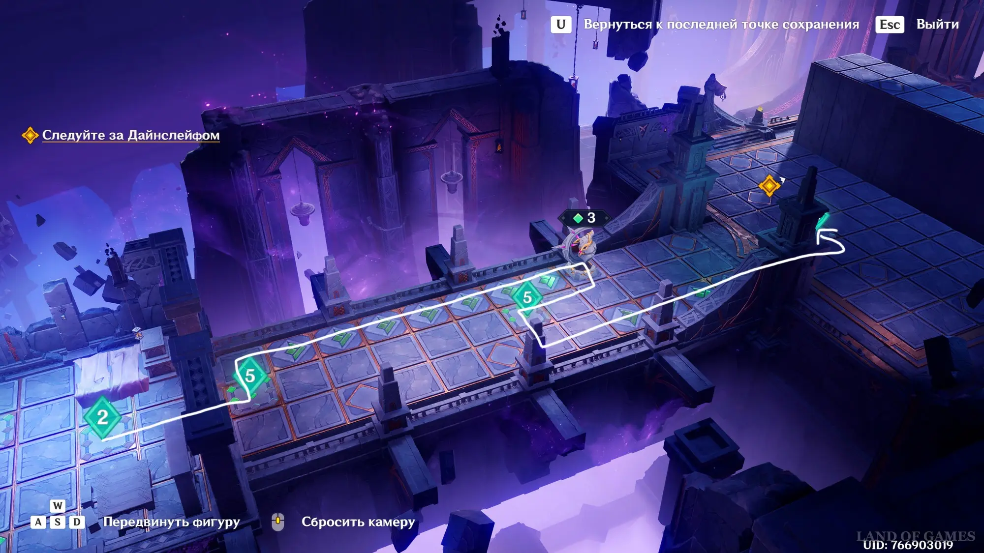 После разговора с Дайнслейфом вам нужно будет последовать за ним. Для этого выйдите из комнаты, а потом встаньте на дорожку с зелеными стрелками, чтобы быстро переместиться вперед. Далее перейдите на плитку с цифрой «5» и доберитесь до следующей тропинки со стрелками, а оттуда дойдите до маркера. На картинке ниже показан весь маршрут.